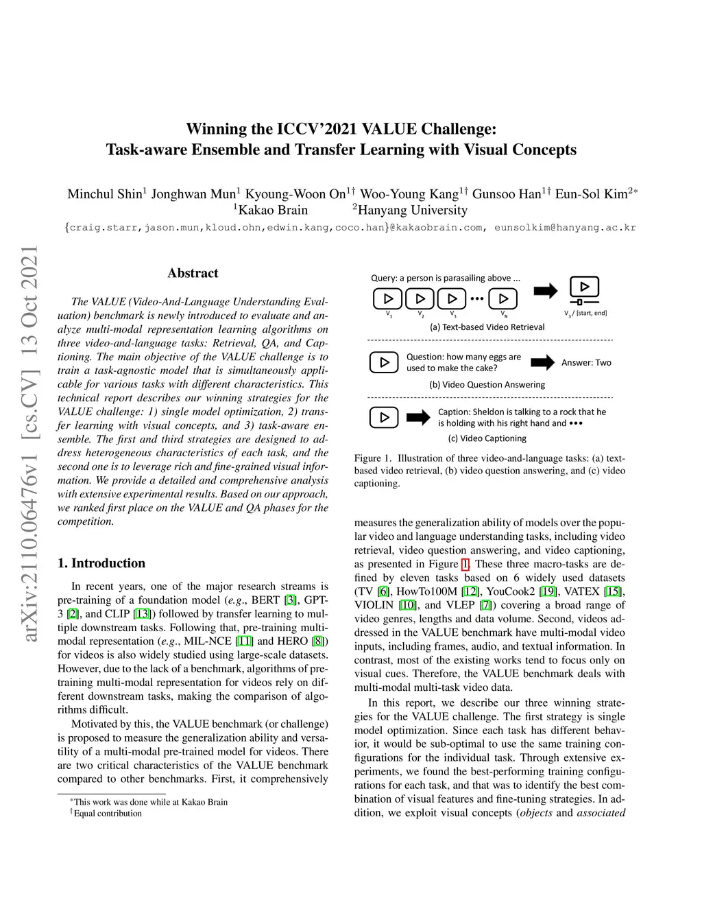 The VALUE (Video-And-Language Understanding Evaluation) benchmark is newly introduced to evaluate and analyze multi-modal representation learning algorithms on three video-and-language tasks: Retrieval, QA, and Captioning. The main objective of the VALUE challenge is to train a task-agnostic model that is simultaneously applicable for various tasks with different characteristics. This technical report describes our winning strategies for the VALUE challenge: 1) single model optimization, 2) transfer learning with visual concepts, and 3) task-aware ensemble. The first and third strategies are designed to address heterogeneous characteristics of each task, and the second one is to leverage rich and fine-grained visual information. We provide a detailed and comprehensive analysis with extensive experimental results. Based on our approach, we ranked first place on the VALUE and QA phases for the competition.