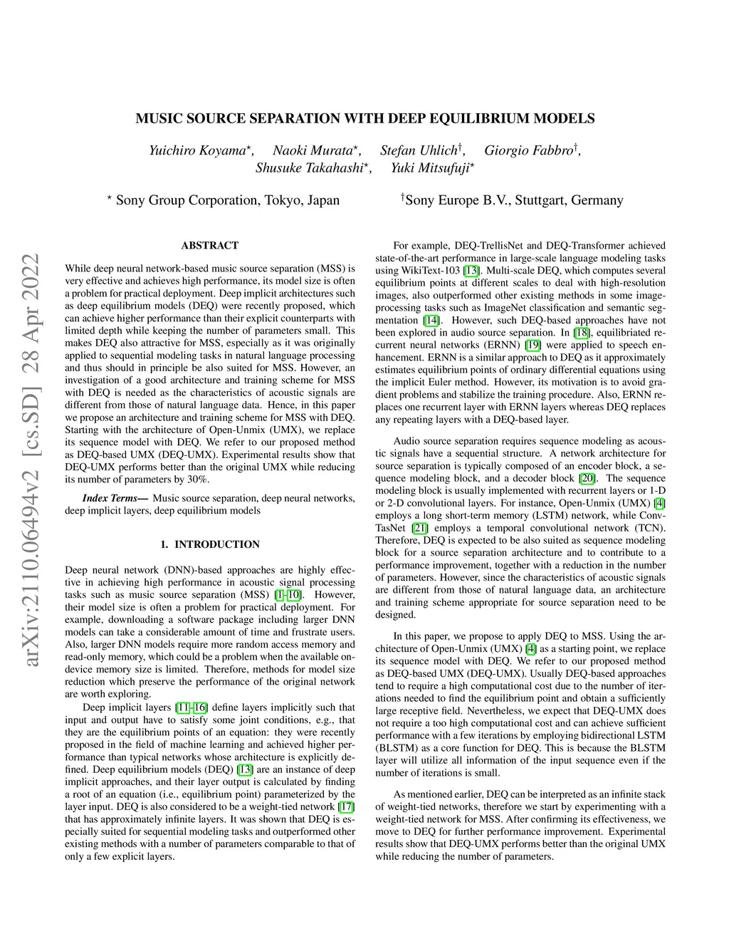 While deep neural network-based music source separation (MSS) is very effective and achieves high performance, its model size is often a problem for practical deployment. Deep implicit architectures such as deep equilibrium models (DEQ) were recently proposed, which can achieve higher performance than their explicit counterparts with limited depth while keeping the number of parameters small. This makes DEQ also attractive for MSS, especially as it was originally applied to sequential modeling tasks in natural language processing and thus should in principle be also suited for MSS. However, an investigation of a good architecture and training scheme for MSS with DEQ is needed as the characteristics of acoustic signals are different from those of natural language data. Hence, in this paper we propose an architecture and training scheme for MSS with DEQ. Starting with the architecture of Open-Unmix (UMX), we replace its sequence model with DEQ. We refer to our proposed method as DEQ-based UMX (DEQ-UMX). Experimental results show that DEQ-UMX performs better than the original UMX while reducing its number of parameters by 30%.