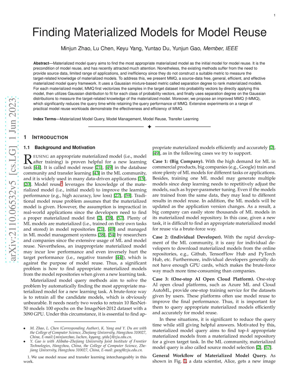 Materialized model query aims to find the most appropriate materialized model as the initial model for model reuse. It is the precondition of model reuse, and has recently attracted much attention. {Nonetheless, the existing methods suffer from the need to provide source data, limited range of applications, and inefficiency since they do not construct a suitable metric to measure the target-related knowledge of materialized models. To address this, we present \textsf{MMQ}, a source-data free, general, efficient, and effective materialized model query framework.} It uses a Gaussian mixture-based metric called separation degree to rank materialized models. For each materialized model, \textsf{MMQ} first vectorizes the samples in the target dataset into probability vectors by directly applying this model, then utilizes Gaussian distribution to fit for each class of probability vectors, and finally uses separation degree on the Gaussian distributions to measure the target-related knowledge of the materialized model. Moreover, we propose an improved \textsf{MMQ} (\textsf{I-MMQ}), which significantly reduces the query time while retaining the query performance of \textsf{MMQ}. Extensive experiments on a range of practical model reuse workloads demonstrate the effectiveness and efficiency of \textsf{MMQ}.