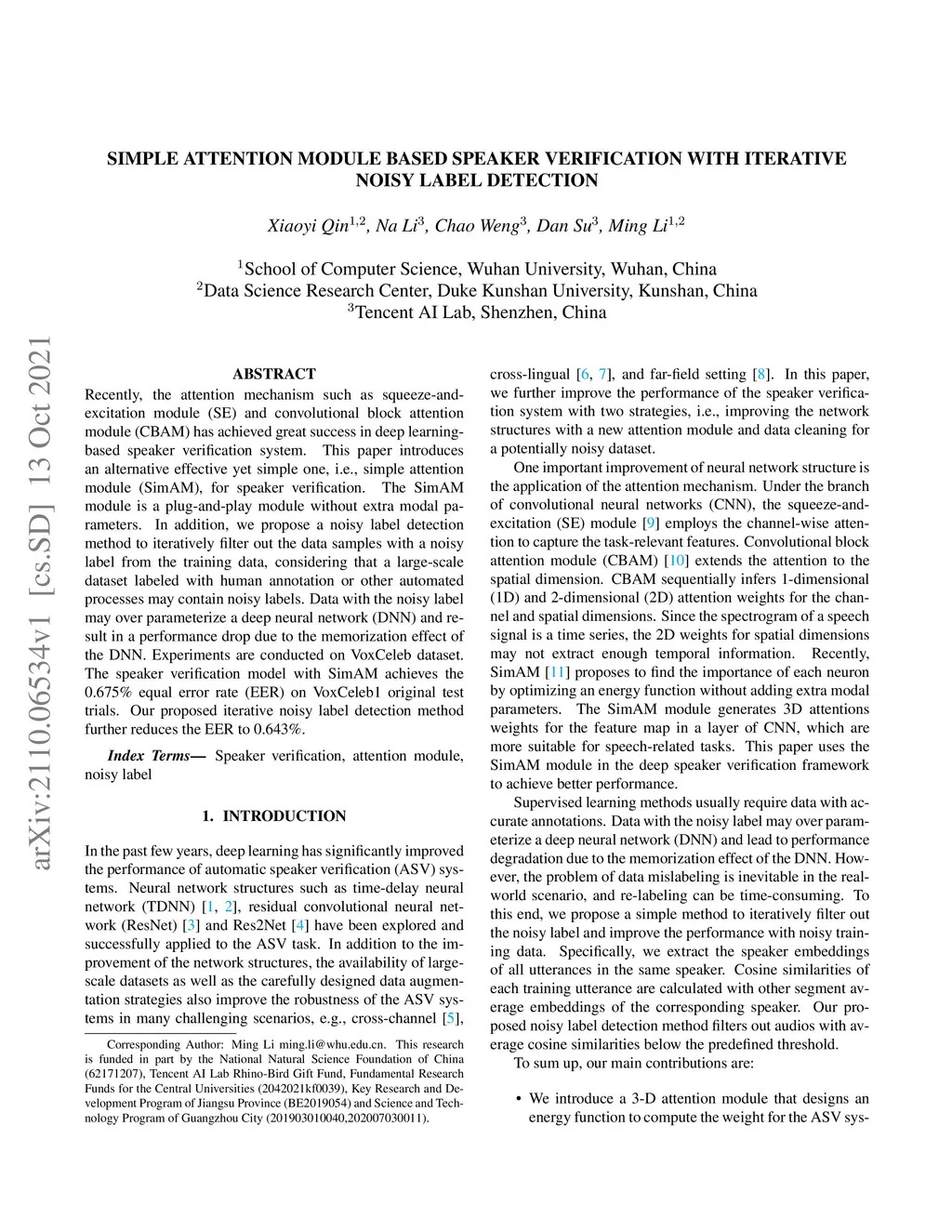 Recently, the attention mechanism such as squeeze-and-excitation module (SE) and convolutional block attention module (CBAM) has achieved great success in deep learning-based speaker verification system. This paper introduces an alternative effective yet simple one, i.e., simple attention module (SimAM), for speaker verification. The SimAM module is a plug-and-play module without extra modal parameters. In addition, we propose a noisy label detection method to iteratively filter out the data samples with a noisy label from the training data, considering that a large-scale dataset labeled with human annotation or other automated processes may contain noisy labels. Data with the noisy label may over parameterize a deep neural network (DNN) and result in a performance drop due to the memorization effect of the DNN. Experiments are conducted on VoxCeleb dataset. The speaker verification model with SimAM achieves the 0.675% equal error rate (EER) on VoxCeleb1 original test trials. Our proposed iterative noisy label detection method further reduces the EER to 0.643%.