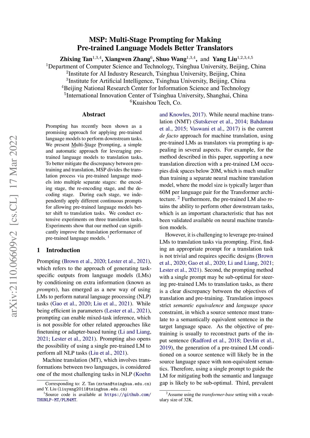 Prompting has recently been shown as a promising approach for applying pre-trained language models to perform downstream tasks. We present Multi-Stage Prompting (MSP), a simple and automatic approach for leveraging pre-trained language models to translation tasks. To better mitigate the discrepancy between pre-training and translation, MSP divides the translation process via pre-trained language models into multiple separate stages: the encoding stage, the re-encoding stage, and the decoding stage. During each stage, we independently apply different continuous prompts for allowing pre-trained language models better shift to translation tasks. We conduct extensive experiments on three translation tasks. Experiments show that our method can significantly improve the translation performance of pre-trained language models.