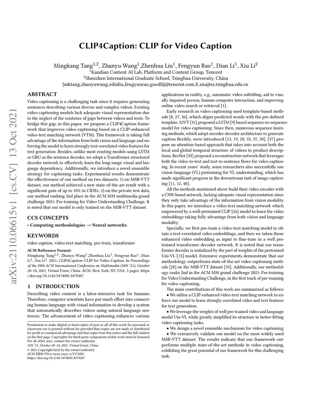 Video captioning is a challenging task since it requires generating sentences describing various diverse and complex videos. Existing video captioning models lack adequate visual representation due to the neglect of the existence of gaps between videos and texts. To bridge this gap, in this paper, we propose a CLIP4Caption framework that improves video captioning based on a CLIP-enhanced video-text matching network (VTM). This framework is taking full advantage of the information from both vision and language and enforcing the model to learn strongly text-correlated video features for text generation. Besides, unlike most existing models using LSTM or GRU as the sentence decoder, we adopt a Transformer structured decoder network to effectively learn the long-range visual and language dependency. Additionally, we introduce a novel ensemble strategy for captioning tasks. Experimental results demonstrate the effectiveness of our method on two datasets: 1) on MSR-VTT dataset, our method achieved a new state-of-the-art result with a significant gain of up to 10% in CIDEr; 2) on the private test data, our method ranking 2nd place in the ACM MM multimedia grand challenge 2021: Pre-training for Video Understanding Challenge. It is noted that our model is only trained on the MSR-VTT dataset.