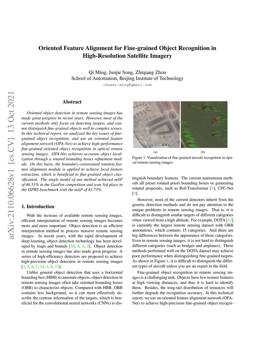 Oriented object detection in remote sensing images has made great progress in recent years. However, most of the current methods only focus on detecting targets, and cannot distinguish fine-grained objects well in complex scenes. In this technical report, we analyzed the key issues of fine-grained object recognition, and use an oriented feature alignment network (OFA-Net) to achieve high-performance fine-grained oriented object recognition in optical remote sensing images. OFA-Net achieves accurate object localization through a rotated bounding boxes refinement module. On this basis, the boundary-constrained rotation feature alignment module is applied to achieve local feature extraction, which is beneficial to fine-grained object classification. The single model of our method achieved mAP of 46.51\% in the GaoFen competition and won 3rd place in the ISPRS benchmark with the mAP of 43.73\%.