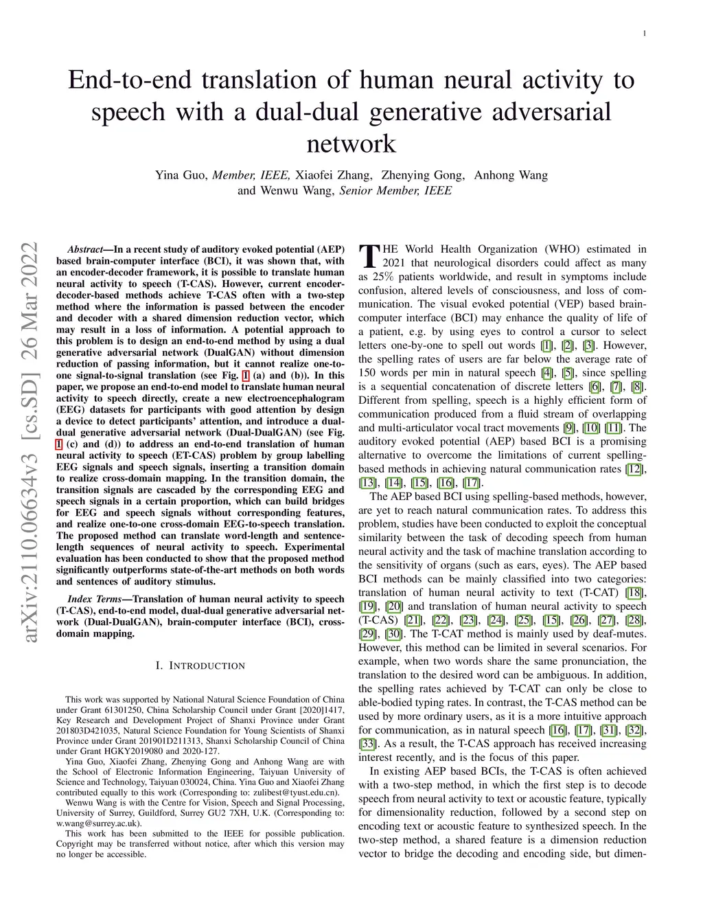 In a recent study of auditory evoked potential (AEP) based brain-computer interface (BCI), it was shown that, with an encoder-decoder framework, it is possible to translate human neural activity to speech (T-CAS). However, current encoder-decoder-based methods achieve T-CAS often with a two-step method where the information is passed between the encoder and decoder with a shared dimension reduction vector, which may result in a loss of information. A potential approach to this problem is to design an end-to-end method by using a dual generative adversarial network (DualGAN) without dimension reduction of passing information, but it cannot realize one-to-one signal-to-signal translation (see Fig.1 (a) and (b)). In this paper, we propose an end-to-end model to translate human neural activity to speech directly, create a new electroencephalogram (EEG) datasets for participants with good attention by design a device to detect participants' attention, and introduce a dual-dual generative adversarial network (Dual-DualGAN) (see Fig. 1 (c) and (d)) to address an end-to-end translation of human neural activity to speech (ET-CAS) problem by group labelling EEG signals and speech signals, inserting a transition domain to realize cross-domain mapping. In the transition domain, the transition signals are cascaded by the corresponding EEG and speech signals in a certain proportion, which can build bridges for EEG and speech signals without corresponding features, and realize one-to-one cross-domain EEG-to-speech translation. The proposed method can translate word-length and sentence-length sequences of neural activity to speech. Experimental evaluation has been conducted to show that the proposed method significantly outperforms state-of-the-art methods on both words and sentences of auditory stimulus.