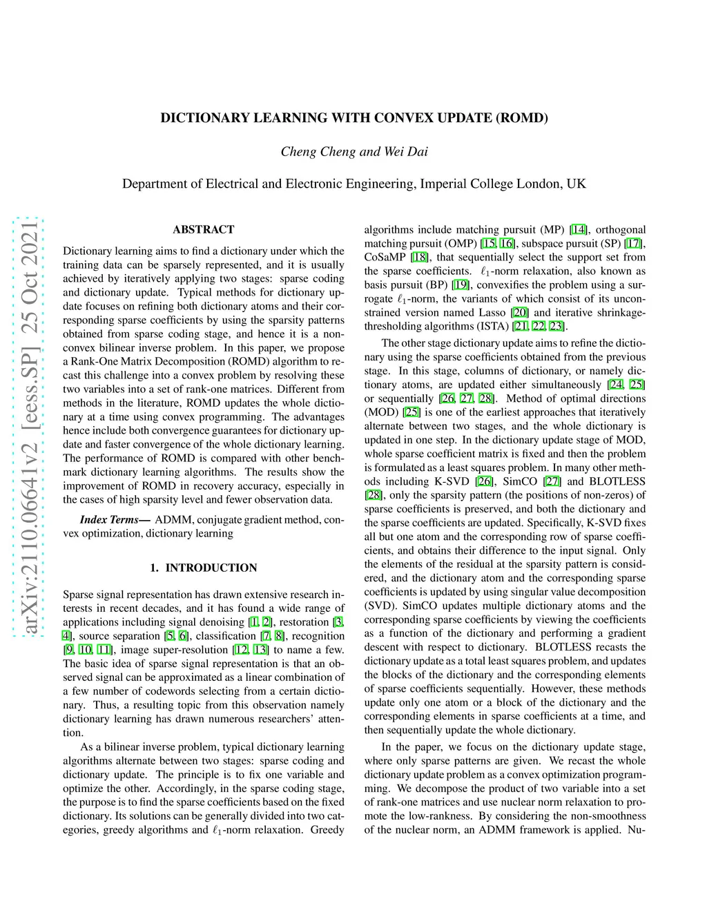 Dictionary learning aims to find a dictionary under which the training data can be sparsely represented, and it is usually achieved by iteratively applying two stages: sparse coding and dictionary update. Typical methods for dictionary update focuses on refining both dictionary atoms and their corresponding sparse coefficients by using the sparsity patterns obtained from sparse coding stage, and hence it is a non-convex bilinear inverse problem. In this paper, we propose a Rank-One Matrix Decomposition (ROMD) algorithm to recast this challenge into a convex problem by resolving these two variables into a set of rank-one matrices. Different from methods in the literature, ROMD updates the whole dictionary at a time using convex programming. The advantages hence include both convergence guarantees for dictionary update and faster convergence of the whole dictionary learning. The performance of ROMD is compared with other benchmark dictionary learning algorithms. The results show the improvement of ROMD in recovery accuracy, especially in the cases of high sparsity level and fewer observation data.