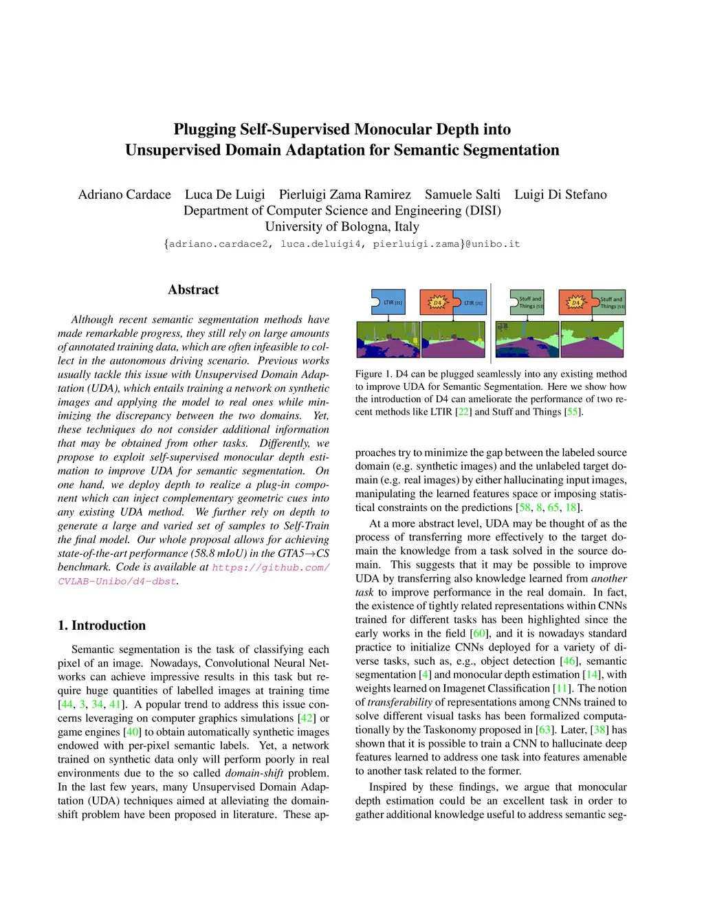 Although recent semantic segmentation methods have made remarkable progress, they still rely on large amounts of annotated training data, which are often infeasible to collect in the autonomous driving scenario. Previous works usually tackle this issue with Unsupervised Domain Adaptation (UDA), which entails training a network on synthetic images and applying the model to real ones while minimizing the discrepancy between the two domains. Yet, these techniques do not consider additional information that may be obtained from other tasks. Differently, we propose to exploit self-supervised monocular depth estimation to improve UDA for semantic segmentation. On one hand, we deploy depth to realize a plug-in component which can inject complementary geometric cues into any existing UDA method. We further rely on depth to generate a large and varied set of samples to Self-Train the final model. Our whole proposal allows for achieving state-of-the-art performance (58.8 mIoU) in the GTA5->CS benchmark benchmark. Code is available at https://github.com/CVLAB-Unibo/d4-dbst.
