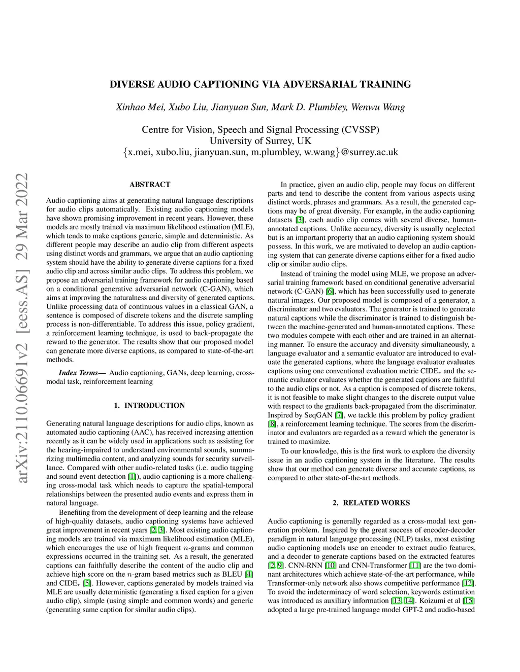 Audio captioning aims at generating natural language descriptions for audio clips automatically. Existing audio captioning models have shown promising improvement in recent years. However, these models are mostly trained via maximum likelihood estimation (MLE),which tends to make captions generic, simple and deterministic. As different people may describe an audio clip from different aspects using distinct words and grammars, we argue that an audio captioning system should have the ability to generate diverse captions for a fixed audio clip and across similar audio clips. To address this problem, we propose an adversarial training framework for audio captioning based on a conditional generative adversarial network (C-GAN), which aims at improving the naturalness and diversity of generated captions. Unlike processing data of continuous values in a classical GAN, a sentence is composed of discrete tokens and the discrete sampling process is non-differentiable. To address this issue, policy gradient, a reinforcement learning technique, is used to back-propagate the reward to the generator. The results show that our proposed model can generate more diverse captions, as compared to state-of-the-art methods.