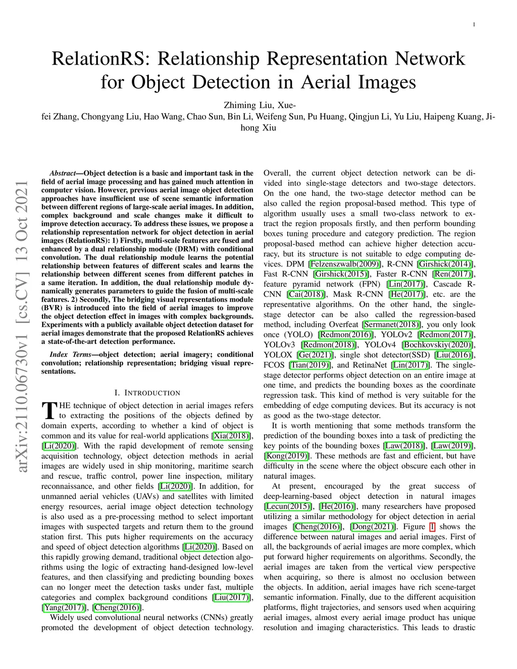 Object detection is a basic and important task in the field of aerial image processing and has gained much attention in computer vision. However, previous aerial image object detection approaches have insufficient use of scene semantic information between different regions of large-scale aerial images. In addition, complex background and scale changes make it difficult to improve detection accuracy. To address these issues, we propose a relationship representation network for object detection in aerial images (RelationRS): 1) Firstly, multi-scale features are fused and enhanced by a dual relationship module (DRM) with conditional convolution. The dual relationship module learns the potential relationship between features of different scales and learns the relationship between different scenes from different patches in a same iteration. In addition, the dual relationship module dynamically generates parameters to guide the fusion of multi-scale features. 2) Secondly, The bridging visual representations module (BVR) is introduced into the field of aerial images to improve the object detection effect in images with complex backgrounds. Experiments with a publicly available object detection dataset for aerial images demonstrate that the proposed RelationRS achieves a state-of-the-art detection performance.