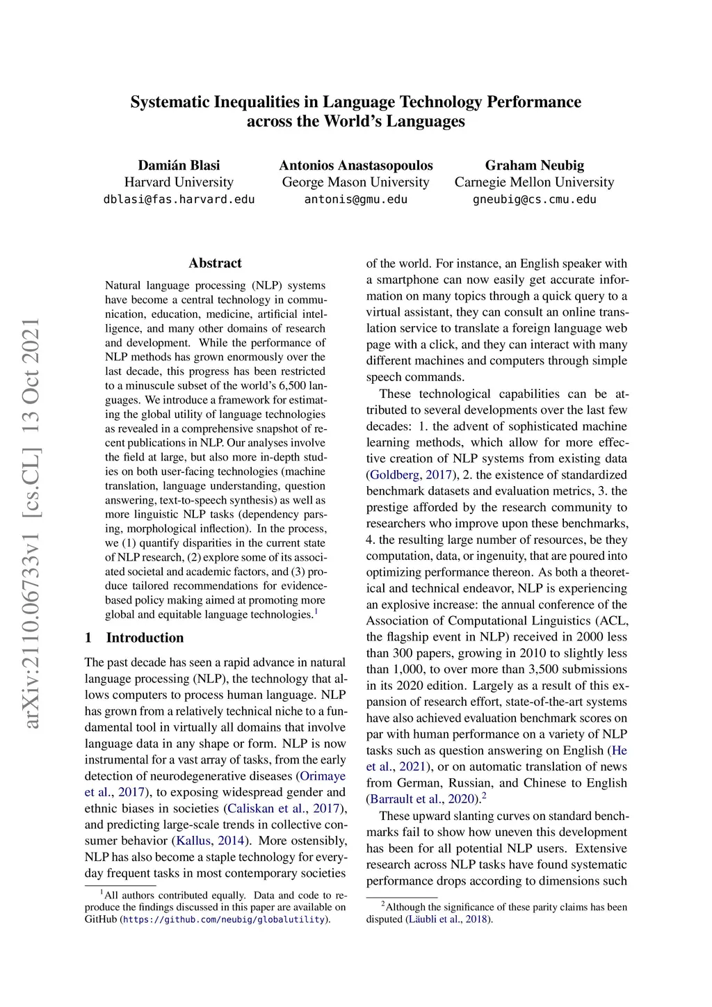 Natural language processing (NLP) systems have become a central technology in communication, education, medicine, artificial intelligence, and many other domains of research and development. While the performance of NLP methods has grown enormously over the last decade, this progress has been restricted to a minuscule subset of the world's 6,500 languages. We introduce a framework for estimating the global utility of language technologies as revealed in a comprehensive snapshot of recent publications in NLP. Our analyses involve the field at large, but also more in-depth studies on both user-facing technologies (machine translation, language understanding, question answering, text-to-speech synthesis) as well as more linguistic NLP tasks (dependency parsing, morphological inflection). In the process, we (1) quantify disparities in the current state of NLP research, (2) explore some of its associated societal and academic factors, and (3) produce tailored recommendations for evidence-based policy making aimed at promoting more global and equitable language technologies.