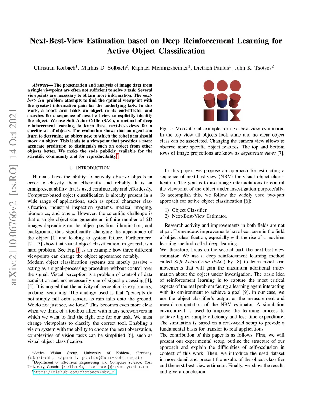 The presentation and analysis of image data from a single viewpoint are often not sufficient to solve a task. Several viewpoints are necessary to obtain more information. The next-best-view problem attempts to find the optimal viewpoint with the greatest information gain for the underlying task. In this work, a robot arm holds an object in its end-effector and searches for a sequence of next-best-view to explicitly identify the object. We use Soft Actor-Critic (SAC), a method of deep reinforcement learning, to learn these next-best-views for a specific set of objects. The evaluation shows that an agent can learn to determine an object pose to which the robot arm should move an object. This leads to a viewpoint that provides a more accurate prediction to distinguish such an object from other objects better. We make the code publicly available for the scientific community and for reproducibility.