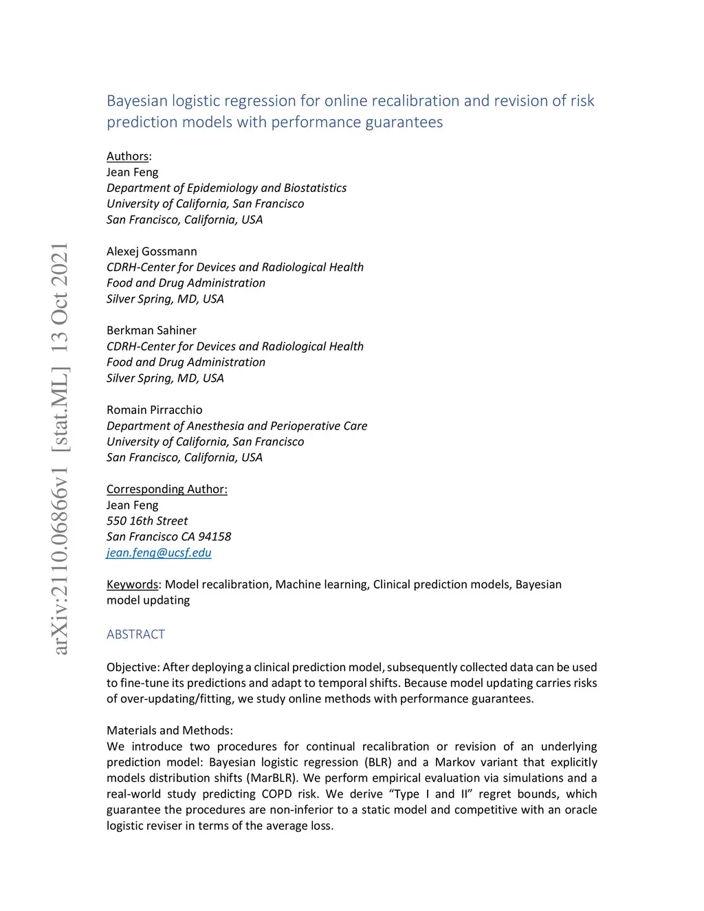 After deploying a clinical prediction model, subsequently collected data can be used to fine-tune its predictions and adapt to temporal shifts. Because model updating carries risks of over-updating/fitting, we study online methods with performance guarantees. We introduce two procedures for continual recalibration or revision of an underlying prediction model: Bayesian logistic regression (BLR) and a Markov variant that explicitly models distribution shifts (MarBLR). We perform empirical evaluation via simulations and a real-world study predicting COPD risk. We derive "Type I and II" regret bounds, which guarantee the procedures are non-inferior to a static model and competitive with an oracle logistic reviser in terms of the average loss. Both procedures consistently outperformed the static model and other online logistic revision methods. In simulations, the average estimated calibration index (aECI) of the original model was 0.828 (95%CI 0.818-0.938). Online recalibration using BLR and MarBLR improved the aECI, attaining 0.265 (95%CI 0.230-0.300) and 0.241 (95%CI 0.216-0.266), respectively. When performing more extensive logistic model revisions, BLR and MarBLR increased the average AUC (aAUC) from 0.767 (95%CI 0.765-0.769) to 0.800 (95%CI 0.798-0.802) and 0.799 (95%CI 0.797-0.801), respectively, in stationary settings and protected against substantial model decay. In the COPD study, BLR and MarBLR dynamically combined the original model with a continually-refitted gradient boosted tree to achieve aAUCs of 0.924 (95%CI 0.913-0.935) and 0.925 (95%CI 0.914-0.935), compared to the static model's aAUC of 0.904 (95%CI 0.892-0.916). Despite its simplicity, BLR is highly competitive with MarBLR. MarBLR outperforms BLR when its prior better reflects the data. BLR and MarBLR can improve the transportability of clinical prediction models and maintain their performance over time.