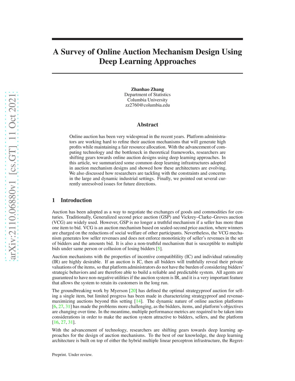 A Survey of Online Auction Mechanism Design Using Deep Learning