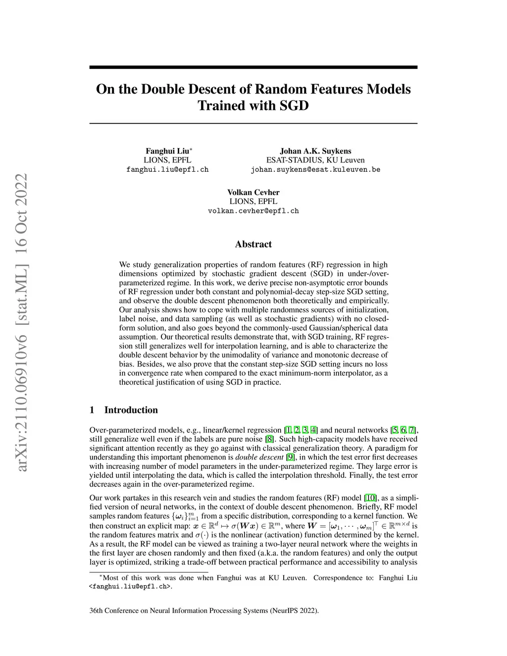 We study generalization properties of random features (RF) regression in high dimensions optimized by stochastic gradient descent (SGD) in under-/over-parameterized regime. In this work, we derive precise non-asymptotic error bounds of RF regression under both constant and polynomial-decay step-size SGD setting, and observe the double descent phenomenon both theoretically and empirically. Our analysis shows how to cope with multiple randomness sources of initialization, label noise, and data sampling (as well as stochastic gradients) with no closed-form solution, and also goes beyond the commonly-used Gaussian/spherical data assumption. Our theoretical results demonstrate that, with SGD training, RF regression still generalizes well for interpolation learning, and is able to characterize the double descent behavior by the unimodality of variance and monotonic decrease of bias. Besides, we also prove that the constant step-size SGD setting incurs no loss in convergence rate when compared to the exact minimum-norm interpolator, as a theoretical justification of using SGD in practice.