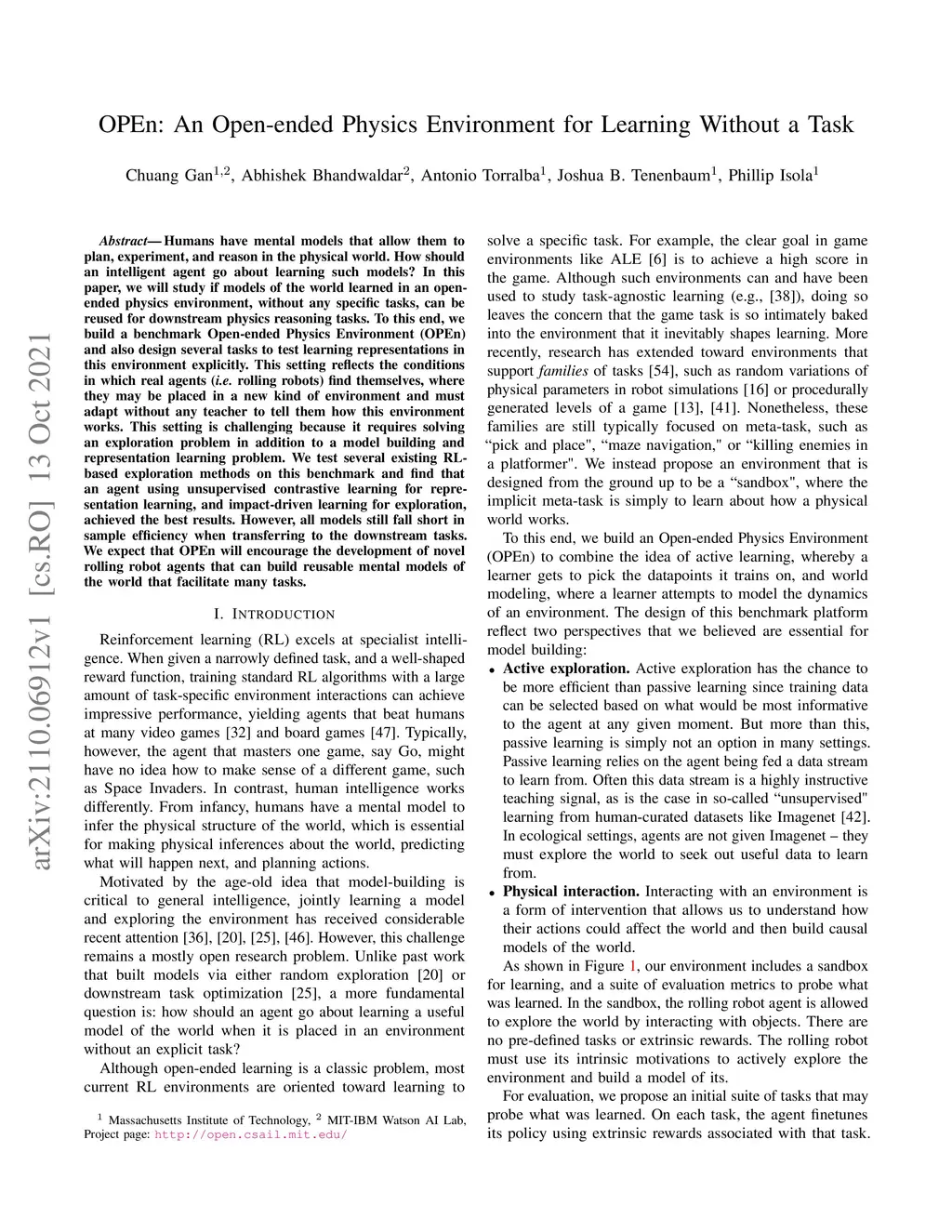 Humans have mental models that allow them to plan, experiment, and reason in the physical world. How should an intelligent agent go about learning such models? In this paper, we will study if models of the world learned in an open-ended physics environment, without any specific tasks, can be reused for downstream physics reasoning tasks. To this end, we build a benchmark Open-ended Physics ENvironment (OPEn) and also design several tasks to test learning representations in this environment explicitly. This setting reflects the conditions in which real agents (i.e. rolling robots) find themselves, where they may be placed in a new kind of environment and must adapt without any teacher to tell them how this environment works. This setting is challenging because it requires solving an exploration problem in addition to a model building and representation learning problem. We test several existing RL-based exploration methods on this benchmark and find that an agent using unsupervised contrastive learning for representation learning, and impact-driven learning for exploration, achieved the best results. However, all models still fall short in sample efficiency when transferring to the downstream tasks. We expect that OPEn will encourage the development of novel rolling robot agents that can build reusable mental models of the world that facilitate many tasks.