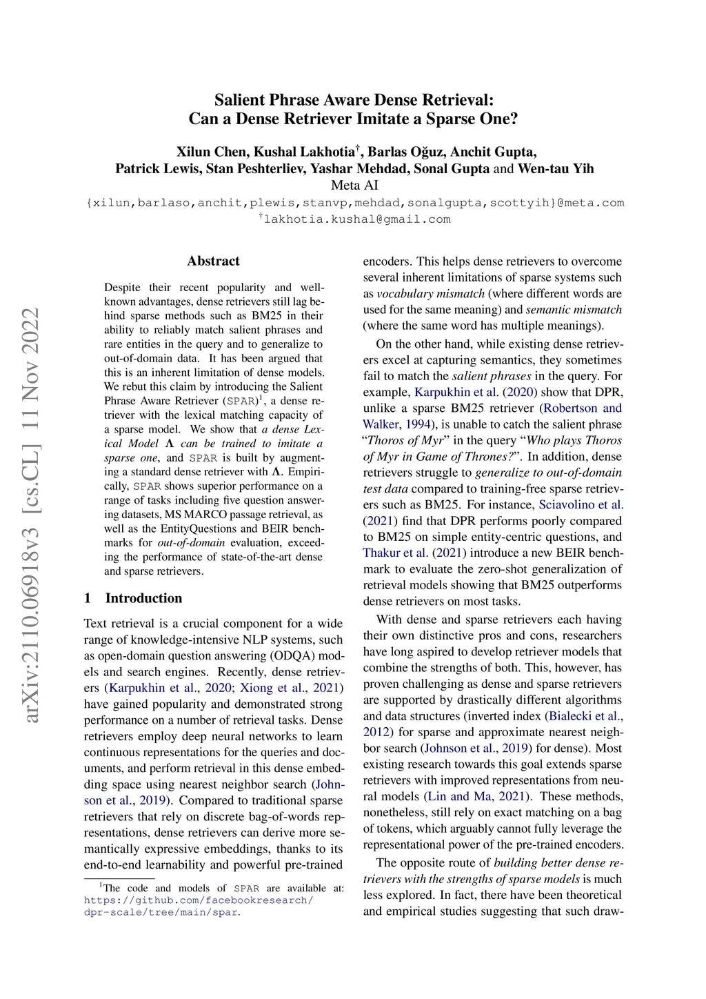 Despite their recent popularity and well-known advantages, dense retrievers still lag behind sparse methods such as BM25 in their ability to reliably match salient phrases and rare entities in the query and to generalize to out-of-domain data. It has been argued that this is an inherent limitation of dense models. We rebut this claim by introducing the Salient Phrase Aware Retriever (SPAR), a dense retriever with the lexical matching capacity of a sparse model. We show that a dense Lexical Model {\Lambda} can be trained to imitate a sparse one, and SPAR is built by augmenting a standard dense retriever with {\Lambda}. Empirically, SPAR shows superior performance on a range of tasks including five question answering datasets, MS MARCO passage retrieval, as well as the EntityQuestions and BEIR benchmarks for out-of-domain evaluation, exceeding the performance of state-of-the-art dense and sparse retrievers. The code and models of SPAR are available at: https://github.com/facebookresearch/dpr-scale/tree/main/spar