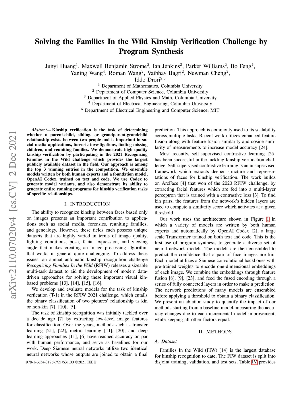 Kinship verification is the task of determining whether a parent-child, sibling, or grandparent-grandchild relationship exists between two people and is important in social media applications, forensic investigations, finding missing children, and reuniting families. We demonstrate high quality kinship verification by participating in the 2021 Recognizing Families in the Wild challenge which provides the largest publicly available dataset in the field. Our approach is among the top 3 winning entries in the competition. We ensemble models written by both human experts and a foundation model, OpenAI Codex, trained on text and code. We use Codex to generate model variants, and also demonstrate its ability to generate entire running programs for kinship verification tasks of specific relationships.