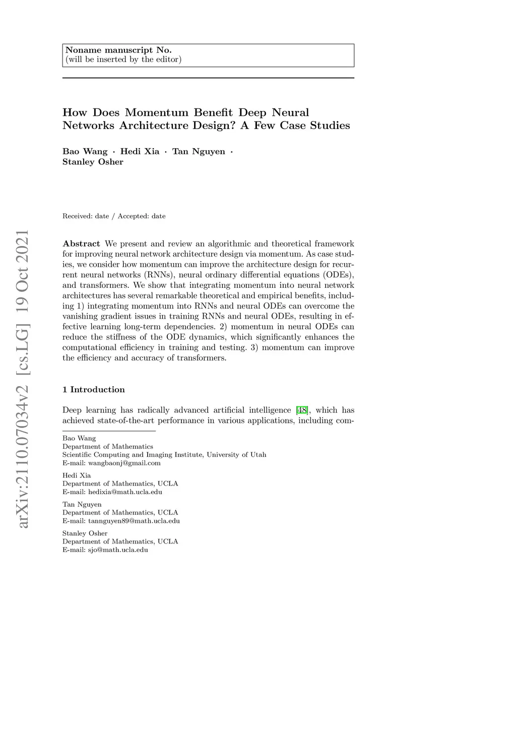 We present and review an algorithmic and theoretical framework for improving neural network architecture design via momentum. As case studies, we consider how momentum can improve the architecture design for recurrent neural networks (RNNs), neural ordinary differential equations (ODEs), and transformers. We show that integrating momentum into neural network architectures has several remarkable theoretical and empirical benefits, including 1) integrating momentum into RNNs and neural ODEs can overcome the vanishing gradient issues in training RNNs and neural ODEs, resulting in effective learning long-term dependencies. 2) momentum in neural ODEs can reduce the stiffness of the ODE dynamics, which significantly enhances the computational efficiency in training and testing. 3) momentum can improve the efficiency and accuracy of transformers.