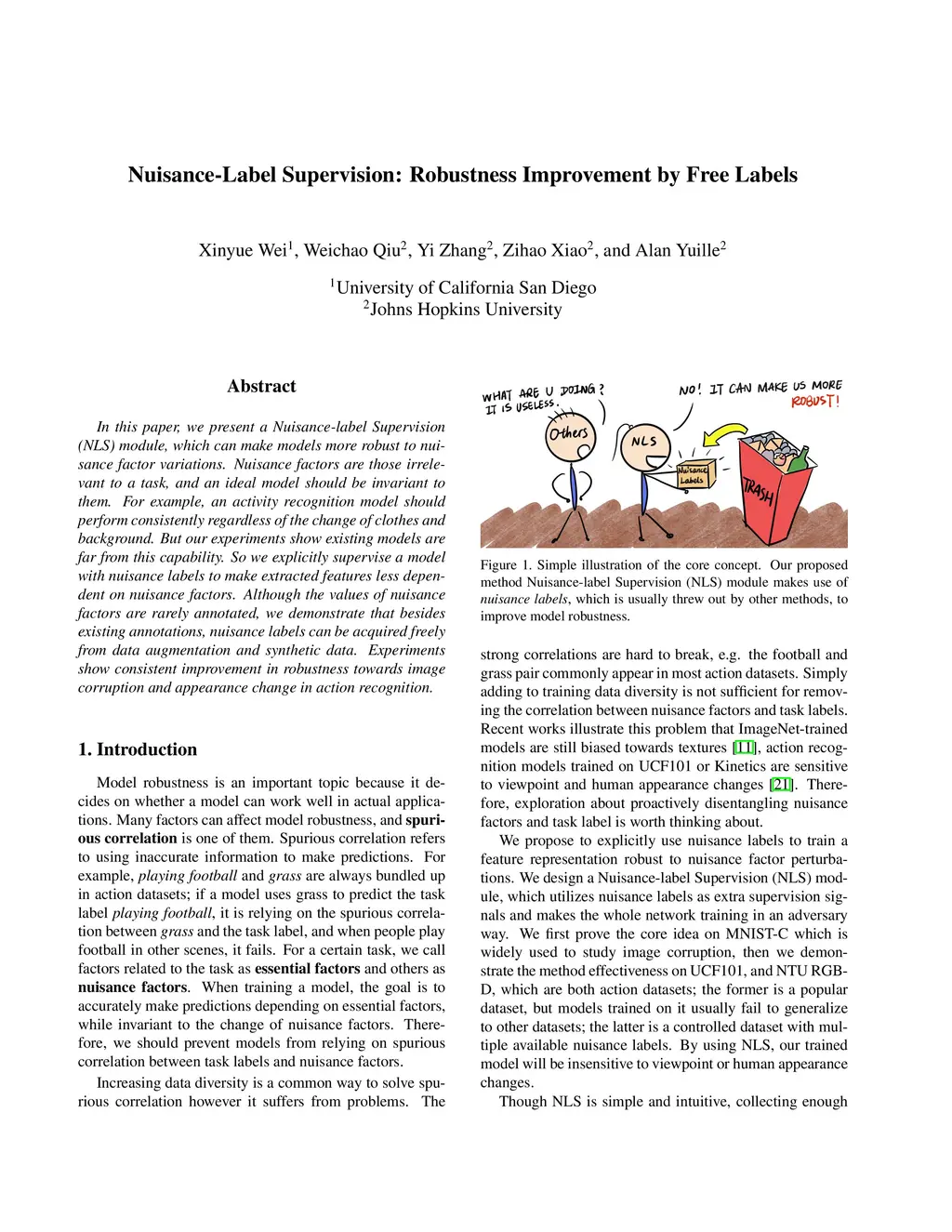In this paper, we present a Nuisance-label Supervision (NLS) module, which can make models more robust to nuisance factor variations. Nuisance factors are those irrelevant to a task, and an ideal model should be invariant to them. For example, an activity recognition model should perform consistently regardless of the change of clothes and background. But our experiments show existing models are far from this capability. So we explicitly supervise a model with nuisance labels to make extracted features less dependent on nuisance factors. Although the values of nuisance factors are rarely annotated, we demonstrate that besides existing annotations, nuisance labels can be acquired freely from data augmentation and synthetic data. Experiments show consistent improvement in robustness towards image corruption and appearance change in action recognition.
