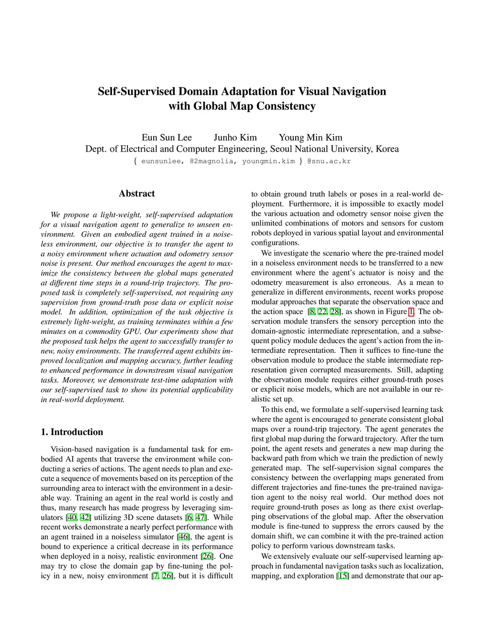 We propose a light-weight, self-supervised adaptation for a visual navigation agent to generalize to unseen environment. Given an embodied agent trained in a noiseless environment, our objective is to transfer the agent to a noisy environment where actuation and odometry sensor noise is present. Our method encourages the agent to maximize the consistency between the global maps generated at different time steps in a round-trip trajectory. The proposed task is completely self-supervised, not requiring any supervision from ground-truth pose data or explicit noise model. In addition, optimization of the task objective is extremely light-weight, as training terminates within a few minutes on a commodity GPU. Our experiments show that the proposed task helps the agent to successfully transfer to new, noisy environments. The transferred agent exhibits improved localization and mapping accuracy, further leading to enhanced performance in downstream visual navigation tasks. Moreover, we demonstrate test-time adaptation with our self-supervised task to show its potential applicability in real-world deployment.