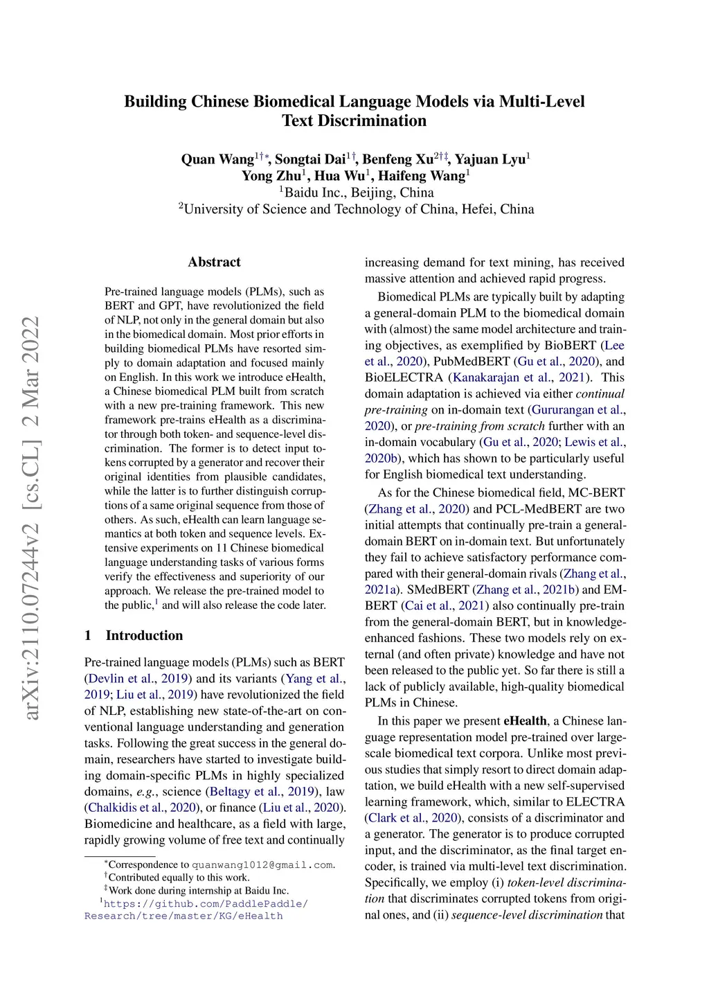 Pre-trained language models (PLMs), such as BERT and GPT, have revolutionized the field of NLP, not only in the general domain but also in the biomedical domain. Most prior efforts in building biomedical PLMs have resorted simply to domain adaptation and focused mainly on English. In this work we introduce eHealth, a Chinese biomedical PLM built from scratch with a new pre-training framework. This new framework pre-trains eHealth as a discriminator through both token- and sequence-level discrimination. The former is to detect input tokens corrupted by a generator and recover their original identities from plausible candidates, while the latter is to further distinguish corruptions of a same original sequence from those of others. As such, eHealth can learn language semantics at both token and sequence levels. Extensive experiments on 11 Chinese biomedical language understanding tasks of various forms verify the effectiveness and superiority of our approach. We release the pre-trained model at \url{https://github.com/PaddlePaddle/Research/tree/master/KG/eHealth} and will also release the code later.