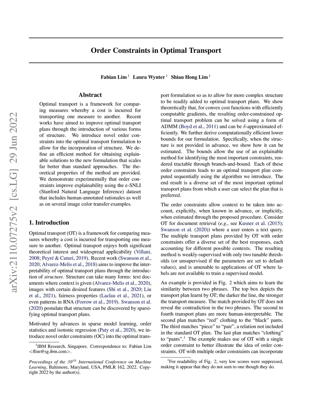 Optimal transport is a framework for comparing measures whereby a cost is incurred for transporting one measure to another. Recent works have aimed to improve optimal transport plans through the introduction of various forms of structure. We introduce novel order constraints into the optimal transport formulation to allow for the incorporation of structure. We define an efficient method for obtaining explainable solutions to the new formulation that scales far better than standard approaches. The theoretical properties of the method are provided. We demonstrate experimentally that order constraints improve explainability using the e-SNLI (Stanford Natural Language Inference) dataset that includes human-annotated rationales as well as on several image color transfer examples.