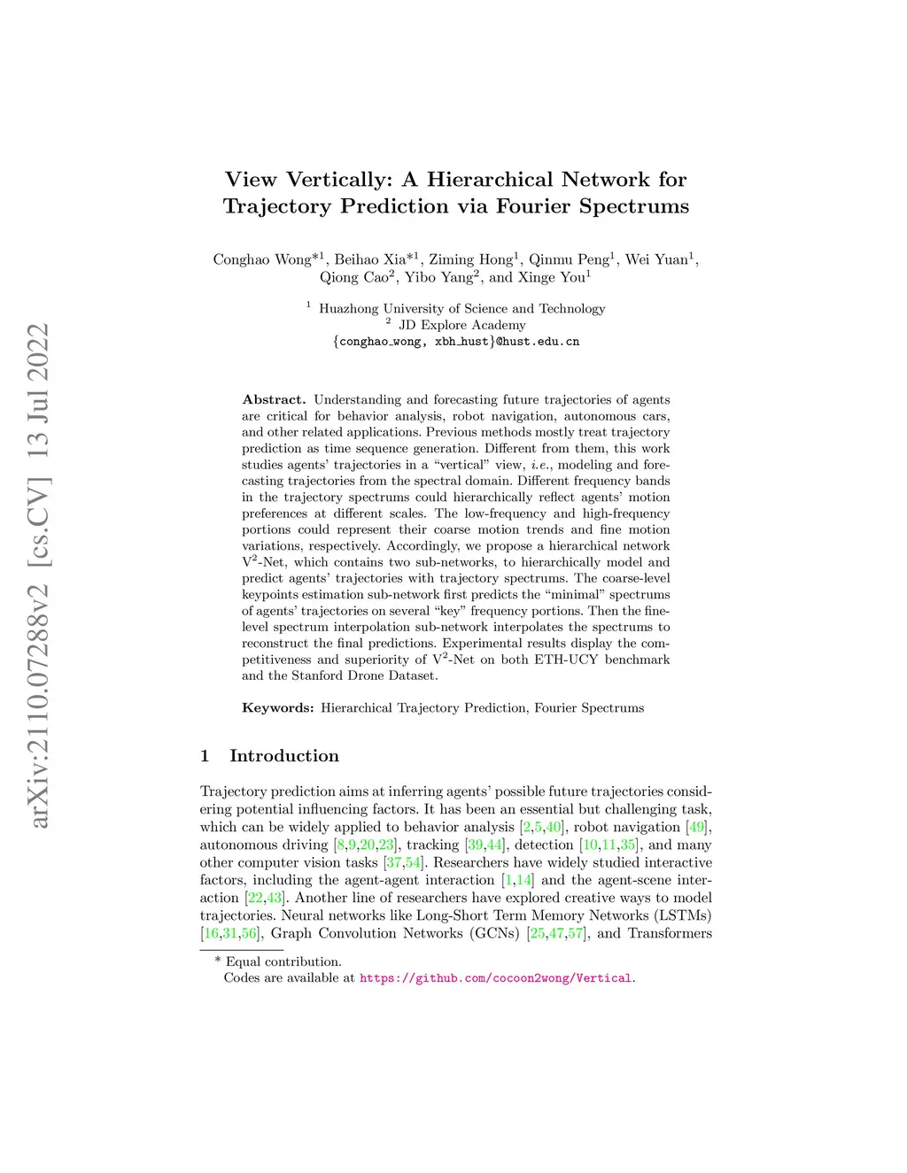 Understanding and forecasting future trajectories of agents are critical for behavior analysis, robot navigation, autonomous cars, and other related applications. Previous methods mostly treat trajectory prediction as time sequence generation. Different from them, this work studies agents' trajectories in a "vertical" view, i.e., modeling and forecasting trajectories from the spectral domain. Different frequency bands in the trajectory spectrums could hierarchically reflect agents' motion preferences at different scales. The low-frequency and high-frequency portions could represent their coarse motion trends and fine motion variations, respectively. Accordingly, we propose a hierarchical network V-Net, which contains two sub-networks, to hierarchically model and predict agents' trajectories with trajectory spectrums. The coarse-level keypoints estimation sub-network first predicts the "minimal" spectrums of agents' trajectories on several "key" frequency portions. Then the fine-level spectrum interpolation sub-network interpolates the spectrums to reconstruct the final predictions. Experimental results display the competitiveness and superiority of V-Net on both ETH-UCY benchmark and the Stanford Drone Dataset.