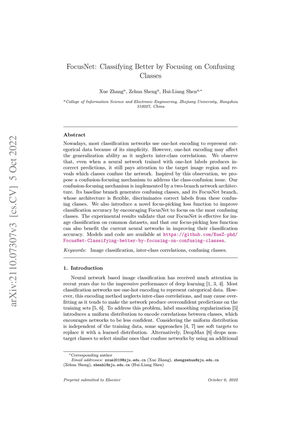 Nowadays, most classification networks use one-hot encoding to represent categorical data because of its simplicity. However, one-hot encoding may affect the generalization ability as it neglects inter-class correlations. We observe that, even when a neural network trained with one-hot labels produces incorrect predictions, it still pays attention to the target image region and reveals which classes confuse the network. Inspired by this observation, we propose a confusion-focusing mechanism to address the class-confusion issue. Our confusion-focusing mechanism is implemented by a two-branch network architecture. Its baseline branch generates confusing classes, and its FocusNet branch, whose architecture is flexible, discriminates correct labels from these confusing classes. We also introduce a novel focus-picking loss function to improve classification accuracy by encouraging FocusNet to focus on the most confusing classes. The experimental results validate that our FocusNet is effective for image classification on common datasets, and that our focus-picking loss function can also benefit the current neural networks in improving their classification accuracy.
