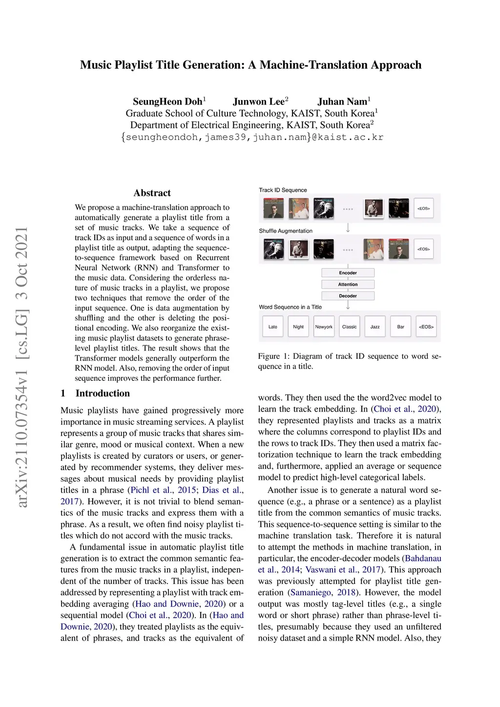We propose a machine-translation approach to automatically generate a playlist title from a set of music tracks. We take a sequence of track IDs as input and a sequence of words in a playlist title as output, adapting the sequence-to-sequence framework based on Recurrent Neural Network (RNN) and Transformer to the music data. Considering the orderless nature of music tracks in a playlist, we propose two techniques that remove the order of the input sequence. One is data augmentation by shuffling and the other is deleting the positional encoding. We also reorganize the existing music playlist datasets to generate phrase-level playlist titles. The result shows that the Transformer models generally outperform the RNN model. Also, removing the order of input sequence improves the performance further.