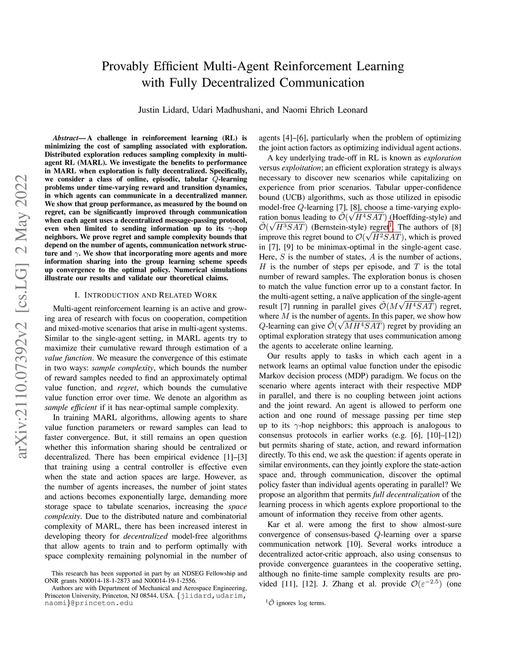 A challenge in reinforcement learning (RL) is minimizing the cost of sampling associated with exploration. Distributed exploration reduces sampling complexity in multi-agent RL (MARL). We investigate the benefits to performance in MARL when exploration is fully decentralized. Specifically, we consider a class of online, episodic, tabular -learning problems under time-varying reward and transition dynamics, in which agents can communicate in a decentralized manner.We show that group performance, as measured by the bound on regret, can be significantly improved through communication when each agent uses a decentralized message-passing protocol, even when limited to sending information up to its -hop neighbors. We prove regret and sample complexity bounds that depend on the number of agents, communication network structure and We show that incorporating more agents and more information sharing into the group learning scheme speeds up convergence to the optimal policy. Numerical simulations illustrate our results and validate our theoretical claims.