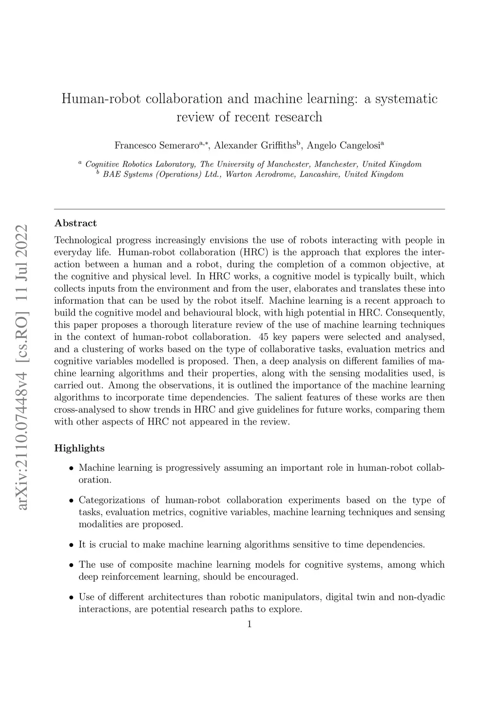 Human-robot collaboration and machine learning: a systematic review of