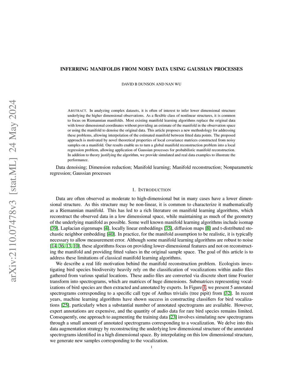 It is often of interest to infer lower-dimensional structure underlying complex data. As a flexible class of non-linear structures, it is common to focus on Riemannian manifolds. Most existing manifold learning algorithms replace the original data with lower-dimensional coordinates without providing an estimate of the manifold or using the manifold to denoise the original data. This article proposes a new methodology to address these problems, allowing interpolation of the estimated manifold between the fitted data points. The proposed approach is motivated by the novel theoretical properties of local covariance matrices constructed from samples near a manifold. Our results enable us to turn a global manifold reconstruction problem into a local regression problem, allowing for the application of Gaussian processes for probabilistic manifold reconstruction. In addition to the theory justifying our methodology, we provide simulated and real data examples to illustrate the performance.