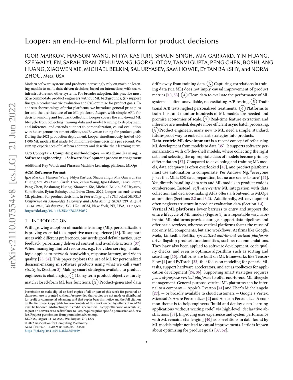 Modern software systems and products increasingly rely on machine learning models to make data-driven decisions based on interactions with users, infrastructure and other systems. For broader adoption, this practice must (i) accommodate product engineers without ML backgrounds, (ii) support finegrain product-metric evaluation and (iii) optimize for product goals. To address shortcomings of prior platforms, we introduce general principles for and the architecture of an ML platform, Looper, with simple APIs for decision-making and feedback collection. Looper covers the end-to-end ML lifecycle from collecting training data and model training to deployment and inference, and extends support to personalization, causal evaluation with heterogenous treatment effects, and Bayesian tuning for product goals. During the 2021 production deployment Looper simultaneously hosted 440-1,000 ML models that made 4-6 million real-time decisions per second. We sum up experiences of platform adopters and describe their learning curve.