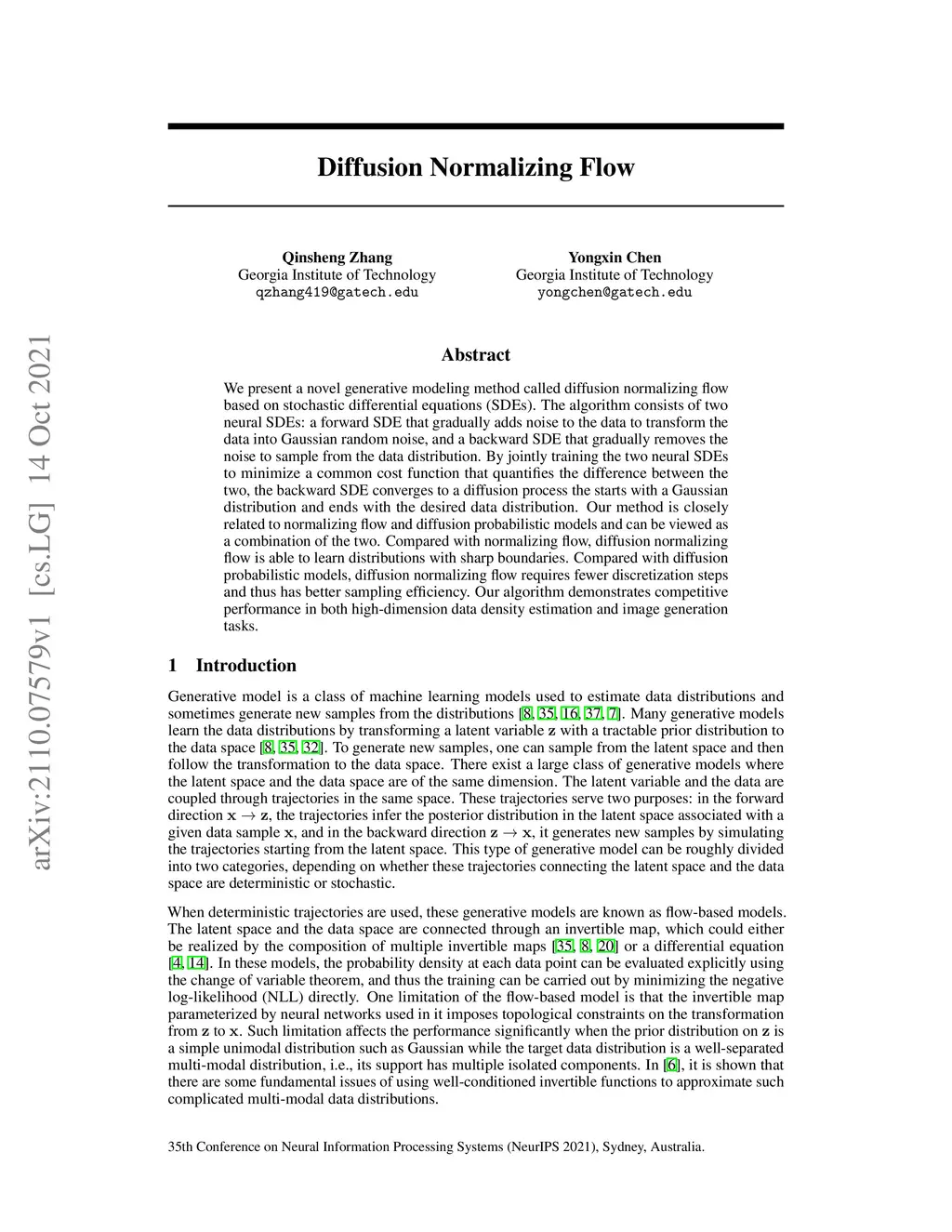 We present a novel generative modeling method called diffusion normalizing flow based on stochastic differential equations (SDEs). The algorithm consists of two neural SDEs: a forward SDE that gradually adds noise to the data to transform the data into Gaussian random noise, and a backward SDE that gradually removes the noise to sample from the data distribution. By jointly training the two neural SDEs to minimize a common cost function that quantifies the difference between the two, the backward SDE converges to a diffusion process the starts with a Gaussian distribution and ends with the desired data distribution. Our method is closely related to normalizing flow and diffusion probabilistic models and can be viewed as a combination of the two. Compared with normalizing flow, diffusion normalizing flow is able to learn distributions with sharp boundaries. Compared with diffusion probabilistic models, diffusion normalizing flow requires fewer discretization steps and thus has better sampling efficiency. Our algorithm demonstrates competitive performance in both high-dimension data density estimation and image generation tasks.