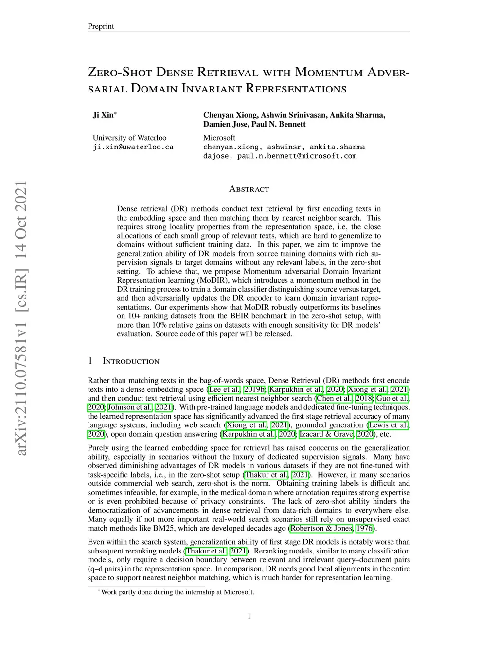 Zero-Shot Dense Retrieval with Momentum Adversarial Domain Invariant