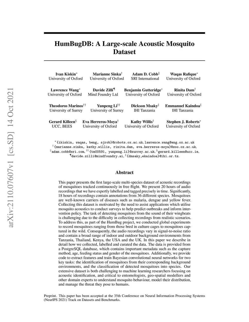 This paper presents the first large-scale multi-species dataset of acoustic recordings of mosquitoes tracked continuously in free flight. We present 20 hours of audio recordings that we have expertly labelled and tagged precisely in time. Significantly, 18 hours of recordings contain annotations from 36 different species. Mosquitoes are well-known carriers of diseases such as malaria, dengue and yellow fever. Collecting this dataset is motivated by the need to assist applications which utilise mosquito acoustics to conduct surveys to help predict outbreaks and inform intervention policy. The task of detecting mosquitoes from the sound of their wingbeats is challenging due to the difficulty in collecting recordings from realistic scenarios. To address this, as part of the HumBug project, we conducted global experiments to record mosquitoes ranging from those bred in culture cages to mosquitoes captured in the wild. Consequently, the audio recordings vary in signal-to-noise ratio and contain a broad range of indoor and outdoor background environments from Tanzania, Thailand, Kenya, the USA and the UK. In this paper we describe in detail how we collected, labelled and curated the data. The data is provided from a PostgreSQL database, which contains important metadata such as the capture method, age, feeding status and gender of the mosquitoes. Additionally, we provide code to extract features and train Bayesian convolutional neural networks for two key tasks: the identification of mosquitoes from their corresponding background environments, and the classification of detected mosquitoes into species. Our extensive dataset is both challenging to machine learning researchers focusing on acoustic identification, and critical to entomologists, geo-spatial modellers and other domain experts to understand mosquito behaviour, model their distribution, and manage the threat they pose to humans.