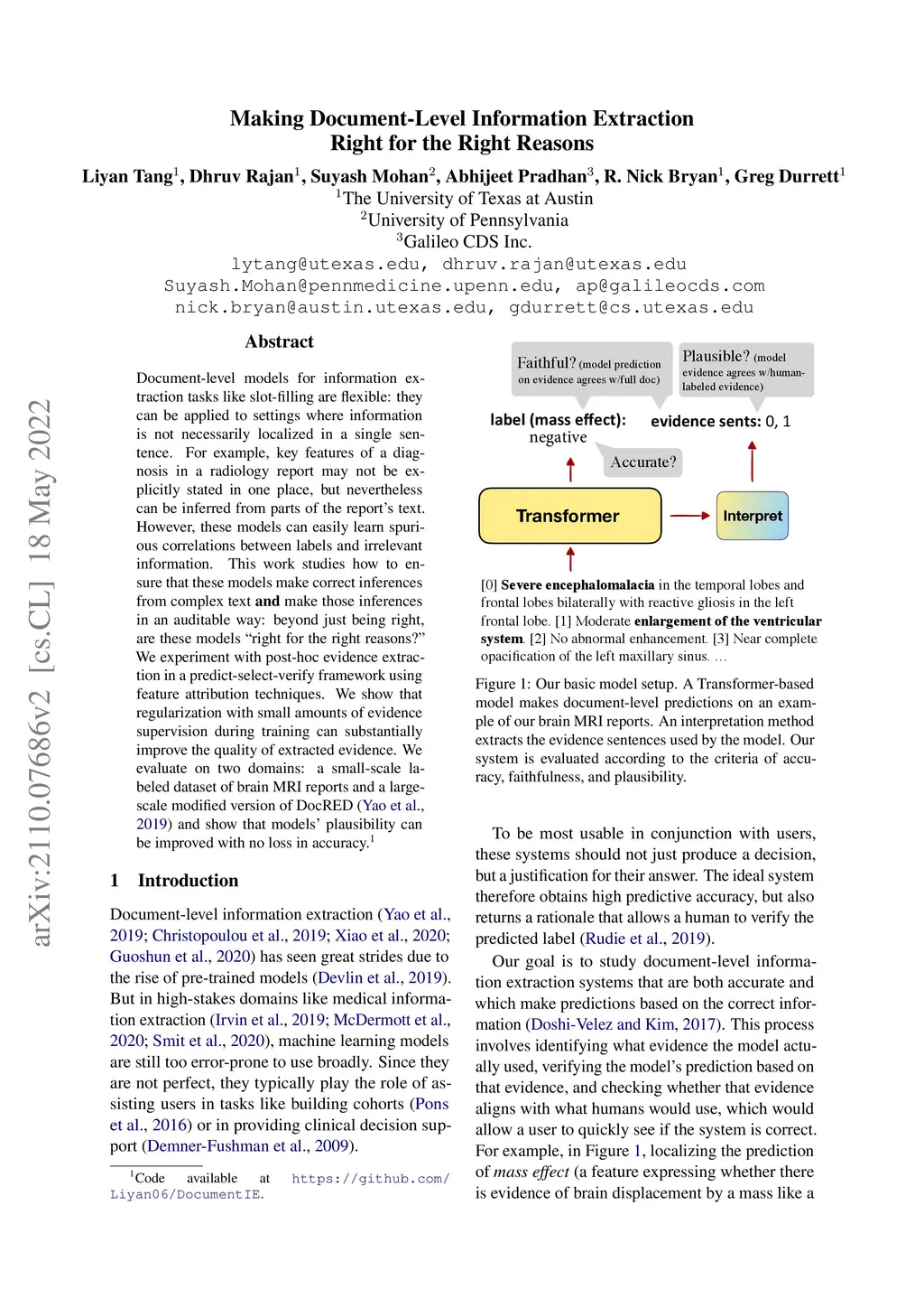 Document-level models for information extraction tasks like slot-filling are flexible: they can be applied to settings where information is not necessarily localized in a single sentence. For example, key features of a diagnosis in a radiology report may not be explicitly stated in one place, but nevertheless can be inferred from parts of the report's text. However, these models can easily learn spurious correlations between labels and irrelevant information. This work studies how to ensure that these models make correct inferences from complex text and make those inferences in an auditable way: beyond just being right, are these models "right for the right reasons?" We experiment with post-hoc evidence extraction in a predict-select-verify framework using feature attribution techniques. We show that regularization with small amounts of evidence supervision during training can substantially improve the quality of extracted evidence. We evaluate on two domains: a small-scale labeled dataset of brain MRI reports and a large-scale modified version of DocRED (Yao et al., 2019) and show that models' plausibility can be improved with no loss in accuracy.