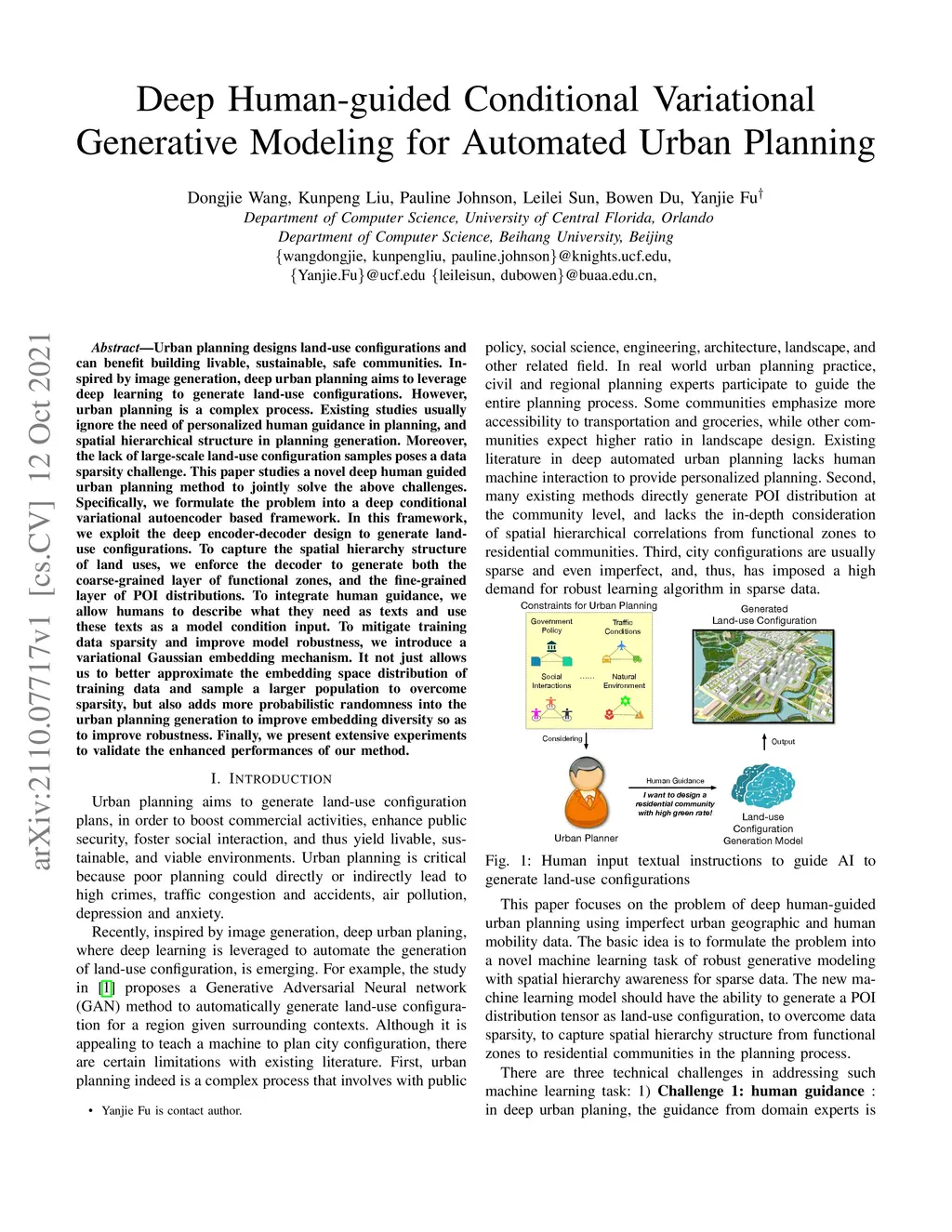 Urban planning designs land-use configurations and can benefit building livable, sustainable, safe communities. Inspired by image generation, deep urban planning aims to leverage deep learning to generate land-use configurations. However, urban planning is a complex process. Existing studies usually ignore the need of personalized human guidance in planning, and spatial hierarchical structure in planning generation. Moreover, the lack of large-scale land-use configuration samples poses a data sparsity challenge. This paper studies a novel deep human guided urban planning method to jointly solve the above challenges. Specifically, we formulate the problem into a deep conditional variational autoencoder based framework. In this framework, we exploit the deep encoder-decoder design to generate land-use configurations. To capture the spatial hierarchy structure of land uses, we enforce the decoder to generate both the coarse-grained layer of functional zones, and the fine-grained layer of POI distributions. To integrate human guidance, we allow humans to describe what they need as texts and use these texts as a model condition input. To mitigate training data sparsity and improve model robustness, we introduce a variational Gaussian embedding mechanism. It not just allows us to better approximate the embedding space distribution of training data and sample a larger population to overcome sparsity, but also adds more probabilistic randomness into the urban planning generation to improve embedding diversity so as to improve robustness. Finally, we present extensive experiments to validate the enhanced performances of our method.