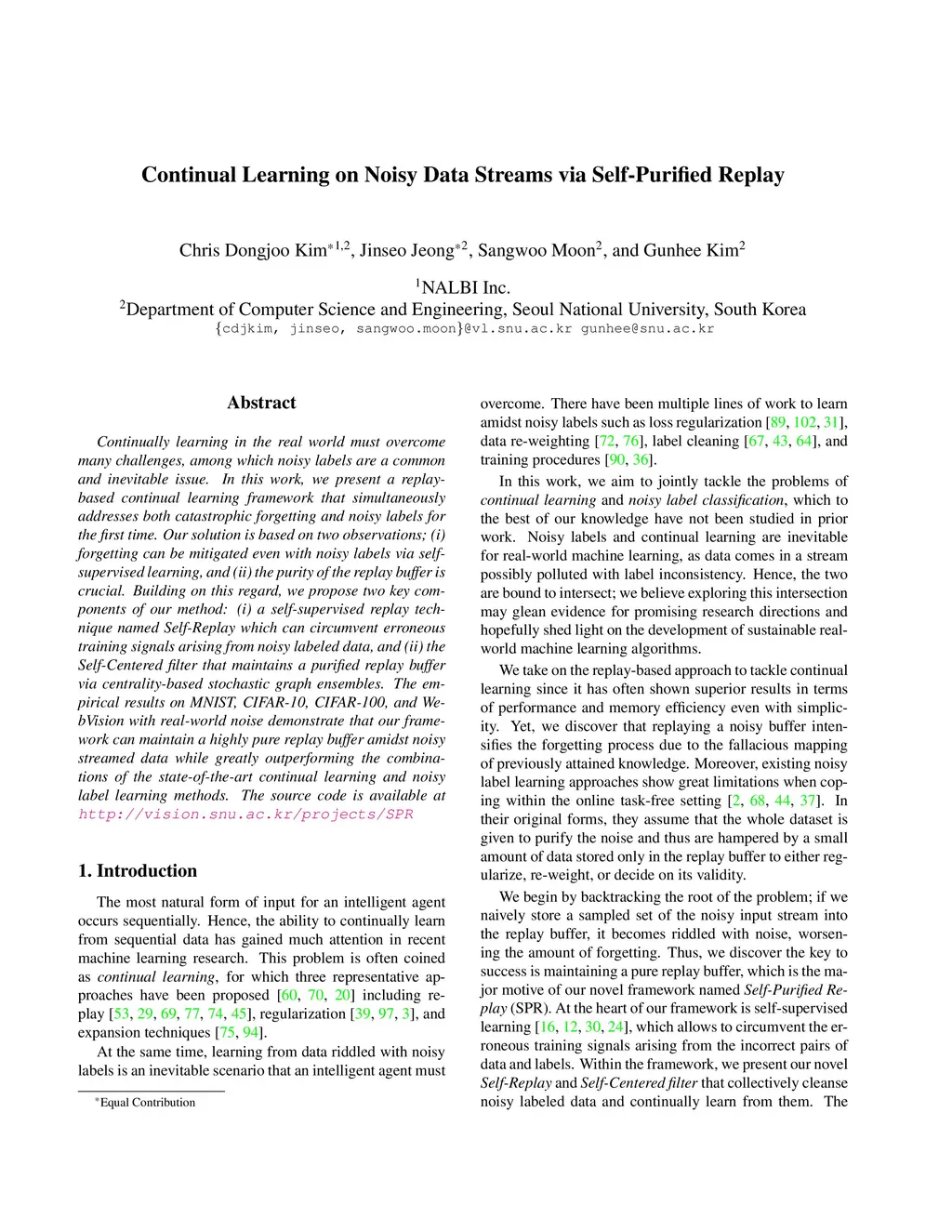 Continually learning in the real world must overcome many challenges, among which noisy labels are a common and inevitable issue. In this work, we present a repla-ybased continual learning framework that simultaneously addresses both catastrophic forgetting and noisy labels for the first time. Our solution is based on two observations; (i) forgetting can be mitigated even with noisy labels via self-supervised learning, and (ii) the purity of the replay buffer is crucial. Building on this regard, we propose two key components of our method: (i) a self-supervised replay technique named Self-Replay which can circumvent erroneous training signals arising from noisy labeled data, and (ii) the Self-Centered filter that maintains a purified replay buffer via centrality-based stochastic graph ensembles. The empirical results on MNIST, CIFAR-10, CIFAR-100, and WebVision with real-world noise demonstrate that our framework can maintain a highly pure replay buffer amidst noisy streamed data while greatly outperforming the combinations of the state-of-the-art continual learning and noisy label learning methods. The source code is available at http://vision.snu.ac.kr/projects/SPR