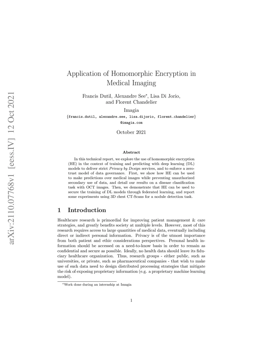 In this technical report, we explore the use of homomorphic encryption (HE) in the context of training and predicting with deep learning (DL) models to deliver strict \textit{Privacy by Design} services, and to enforce a zero-trust model of data governance. First, we show how HE can be used to make predictions over medical images while preventing unauthorized secondary use of data, and detail our results on a disease classification task with OCT images. Then, we demonstrate that HE can be used to secure the training of DL models through federated learning, and report some experiments using 3D chest CT-Scans for a nodule detection task.