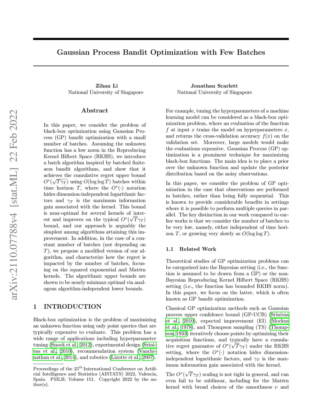 In this paper, we consider the problem of black-box optimization using Gaussian Process (GP) bandit optimization with a small number of batches. Assuming the unknown function has a low norm in the Reproducing Kernel Hilbert Space (RKHS), we introduce a batch algorithm inspired by batched finite-arm bandit algorithms, and show that it achieves the cumulative regret upper bound using batches within time horizon , where the notation hides dimension-independent logarithmic factors and is the maximum information gain associated with the kernel. This bound is near-optimal for several kernels of interest and improves on the typical bound, and our approach is arguably the simplest among algorithms attaining this improvement. In addition, in the case of a constant number of batches (not depending on ), we propose a modified version of our algorithm, and characterize how the regret is impacted by the number of batches, focusing on the squared exponential and Mat\'ern kernels. The algorithmic upper bounds are shown to be nearly minimax optimal via analogous algorithm-independent lower bounds.