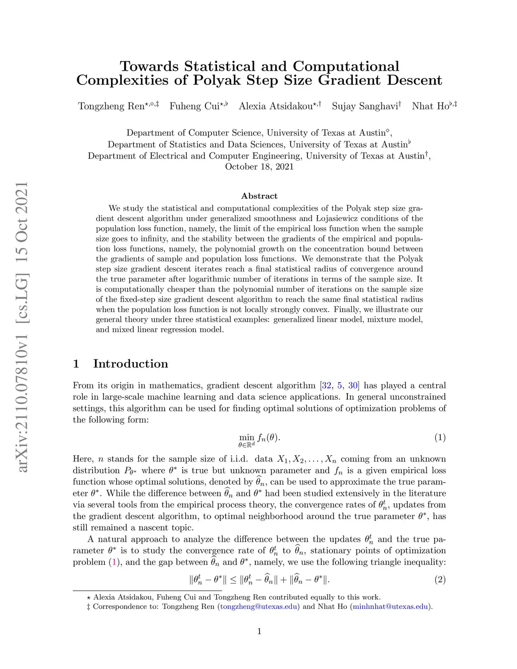 We study the statistical and computational complexities of the Polyak step size gradient descent algorithm under generalized smoothness and Lojasiewicz conditions of the population loss function, namely, the limit of the empirical loss function when the sample size goes to infinity, and the stability between the gradients of the empirical and population loss functions, namely, the polynomial growth on the concentration bound between the gradients of sample and population loss functions. We demonstrate that the Polyak step size gradient descent iterates reach a final statistical radius of convergence around the true parameter after logarithmic number of iterations in terms of the sample size. It is computationally cheaper than the polynomial number of iterations on the sample size of the fixed-step size gradient descent algorithm to reach the same final statistical radius when the population loss function is not locally strongly convex. Finally, we illustrate our general theory under three statistical examples: generalized linear model, mixture model, and mixed linear regression model.
