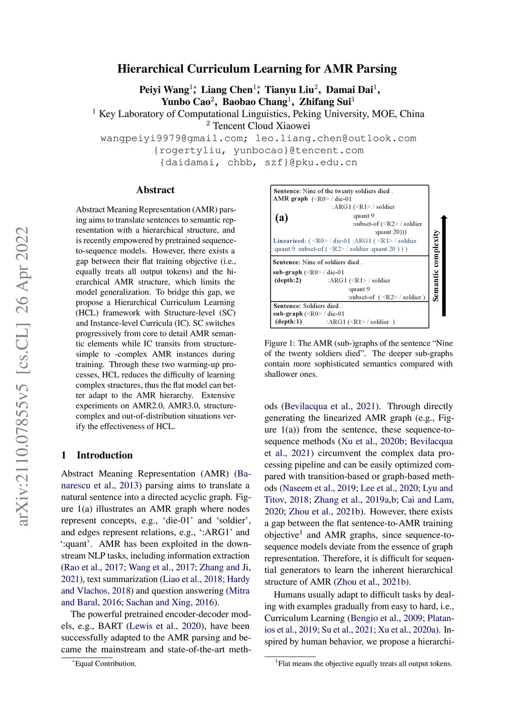 Abstract Meaning Representation (AMR) parsing aims to translate sentences to semantic representation with a hierarchical structure, and is recently empowered by pretrained sequence-to-sequence models. However, there exists a gap between their flat training objective (i.e., equally treats all output tokens) and the hierarchical AMR structure, which limits the model generalization. To bridge this gap, we propose a Hierarchical Curriculum Learning (HCL) framework with Structure-level (SC) and Instance-level Curricula (IC). SC switches progressively from core to detail AMR semantic elements while IC transits from structure-simple to -complex AMR instances during training. Through these two warming-up processes, HCL reduces the difficulty of learning complex structures, thus the flat model can better adapt to the AMR hierarchy. Extensive experiments on AMR2.0, AMR3.0, structure-complex and out-of-distribution situations verify the effectiveness of HCL.