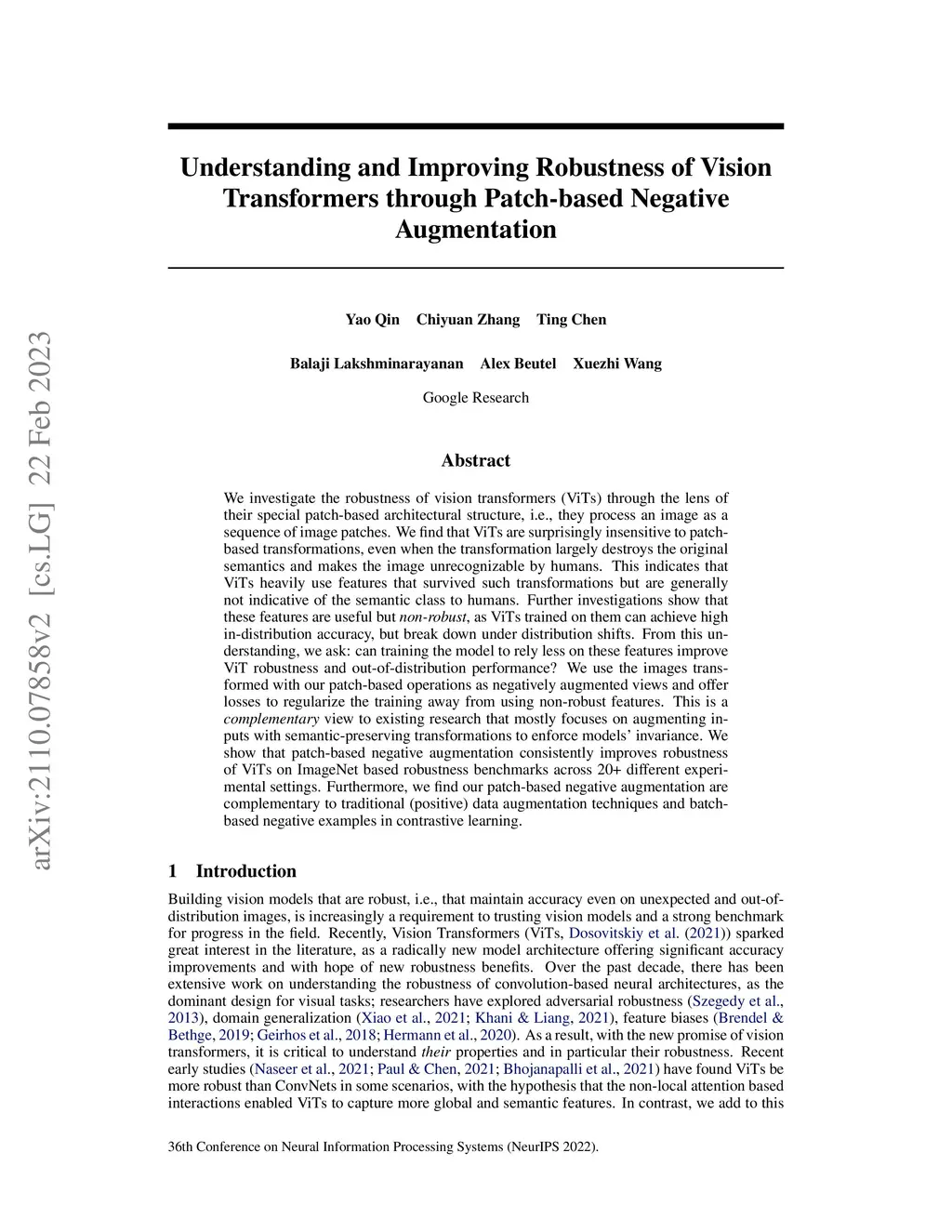 We investigate the robustness of vision transformers (ViTs) through the lens of their special patch-based architectural structure, i.e., they process an image as a sequence of image patches. We find that ViTs are surprisingly insensitive to patch-based transformations, even when the transformation largely destroys the original semantics and makes the image unrecognizable by humans. This indicates that ViTs heavily use features that survived such transformations but are generally not indicative of the semantic class to humans. Further investigations show that these features are useful but non-robust, as ViTs trained on them can achieve high in-distribution accuracy, but break down under distribution shifts. From this understanding, we ask: can training the model to rely less on these features improve ViT robustness and out-of-distribution performance? We use the images transformed with our patch-based operations as negatively augmented views and offer losses to regularize the training away from using non-robust features. This is a complementary view to existing research that mostly focuses on augmenting inputs with semantic-preserving transformations to enforce models' invariance. We show that patch-based negative augmentation consistently improves robustness of ViTs across a wide set of ImageNet based robustness benchmarks. Furthermore, we find our patch-based negative augmentation are complementary to traditional (positive) data augmentation, and together boost the performance further.