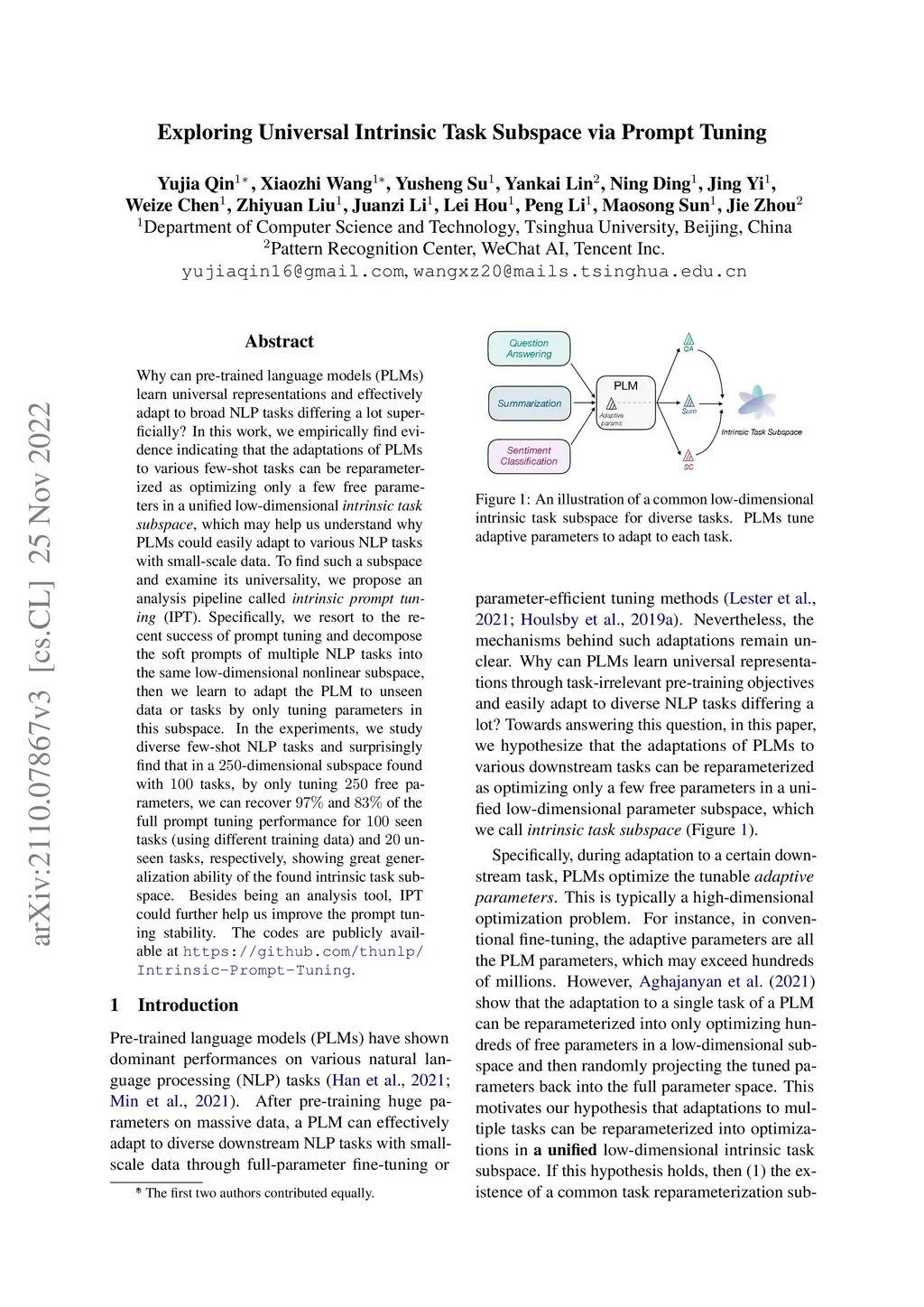 Why can pre-trained language models (PLMs) learn universal representations and effectively adapt to broad NLP tasks differing a lot superficially? In this work, we empirically find evidence indicating that the adaptations of PLMs to various few-shot tasks can be reparameterized as optimizing only a few free parameters in a unified low-dimensional intrinsic task subspace, which may help us understand why PLMs could easily adapt to various NLP tasks with small-scale data. To find such a subspace and examine its universality, we propose an analysis pipeline called intrinsic prompt tuning (IPT). Specifically, we resort to the recent success of prompt tuning and decompose the soft prompts of multiple NLP tasks into the same low-dimensional nonlinear subspace, then we learn to adapt the PLM to unseen data or tasks by only tuning parameters in this subspace. In the experiments, we study diverse few-shot NLP tasks and surprisingly find that in a 250-dimensional subspace found with 100 tasks, by only tuning 250 free parameters, we can recover 97% and 83% of the full prompt tuning performance for 100 seen tasks (using different training data) and 20 unseen tasks, respectively, showing great generalization ability of the found intrinsic task subspace. Besides being an analysis tool, IPT could further help us improve the prompt tuning stability.