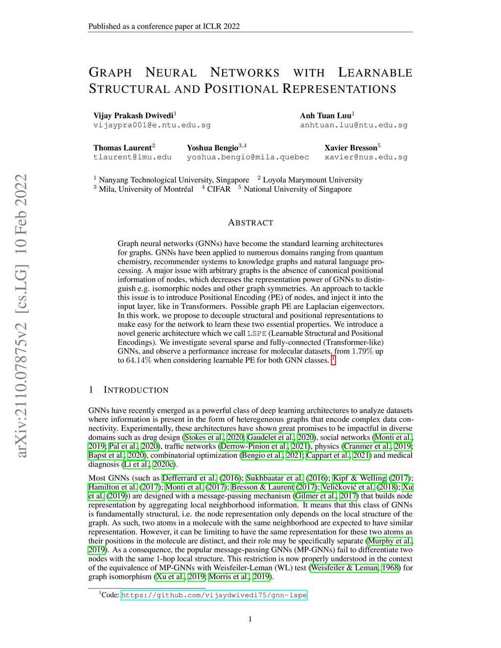 Graph neural networks (GNNs) have become the standard learning architectures for graphs. GNNs have been applied to numerous domains ranging from quantum chemistry, recommender systems to knowledge graphs and natural language processing. A major issue with arbitrary graphs is the absence of canonical positional information of nodes, which decreases the representation power of GNNs to distinguish e.g. isomorphic nodes and other graph symmetries. An approach to tackle this issue is to introduce Positional Encoding (PE) of nodes, and inject it into the input layer, like in Transformers. Possible graph PE are Laplacian eigenvectors. In this work, we propose to decouple structural and positional representations to make easy for the network to learn these two essential properties. We introduce a novel generic architecture which we call LSPE (Learnable Structural and Positional Encodings). We investigate several sparse and fully-connected (Transformer-like) GNNs, and observe a performance increase for molecular datasets, from 1.79% up to 64.14% when considering learnable PE for both GNN classes.