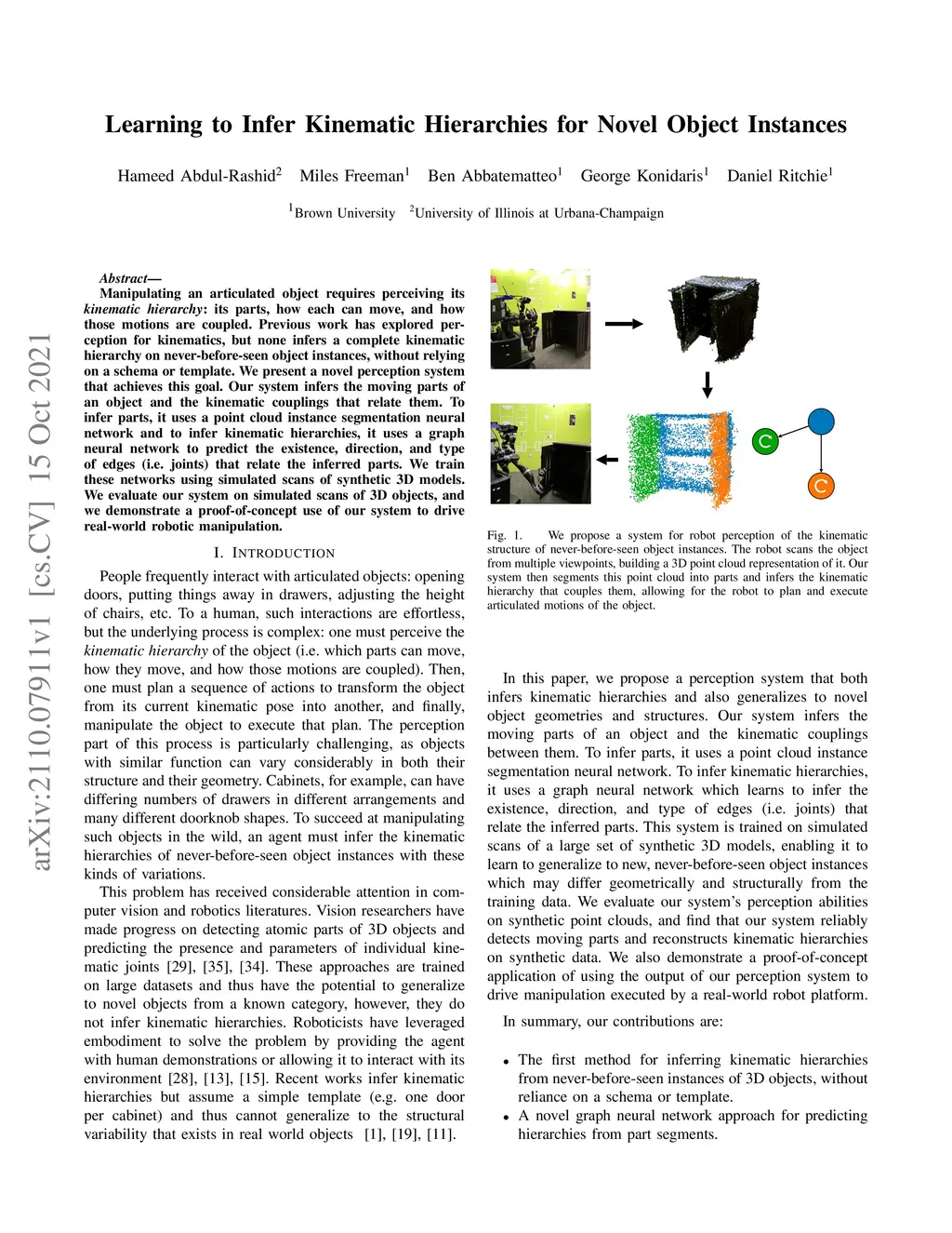 Manipulating an articulated object requires perceiving itskinematic hierarchy: its parts, how each can move, and howthose motions are coupled. Previous work has explored per-ception for kinematics, but none infers a complete kinematichierarchy on never-before-seen object instances, without relyingon a schema or template. We present a novel perception systemthat achieves this goal. Our system infers the moving parts ofan object and the kinematic couplings that relate them. Toinfer parts, it uses a point cloud instance segmentation neuralnetwork and to infer kinematic hierarchies, it uses a graphneural network to predict the existence, direction, and typeof edges (i.e. joints) that relate the inferred parts. We trainthese networks using simulated scans of synthetic 3D models.We evaluate our system on simulated scans of 3D objects, andwe demonstrate a proof-of-concept use of our system to drivereal-world robotic manipulation.