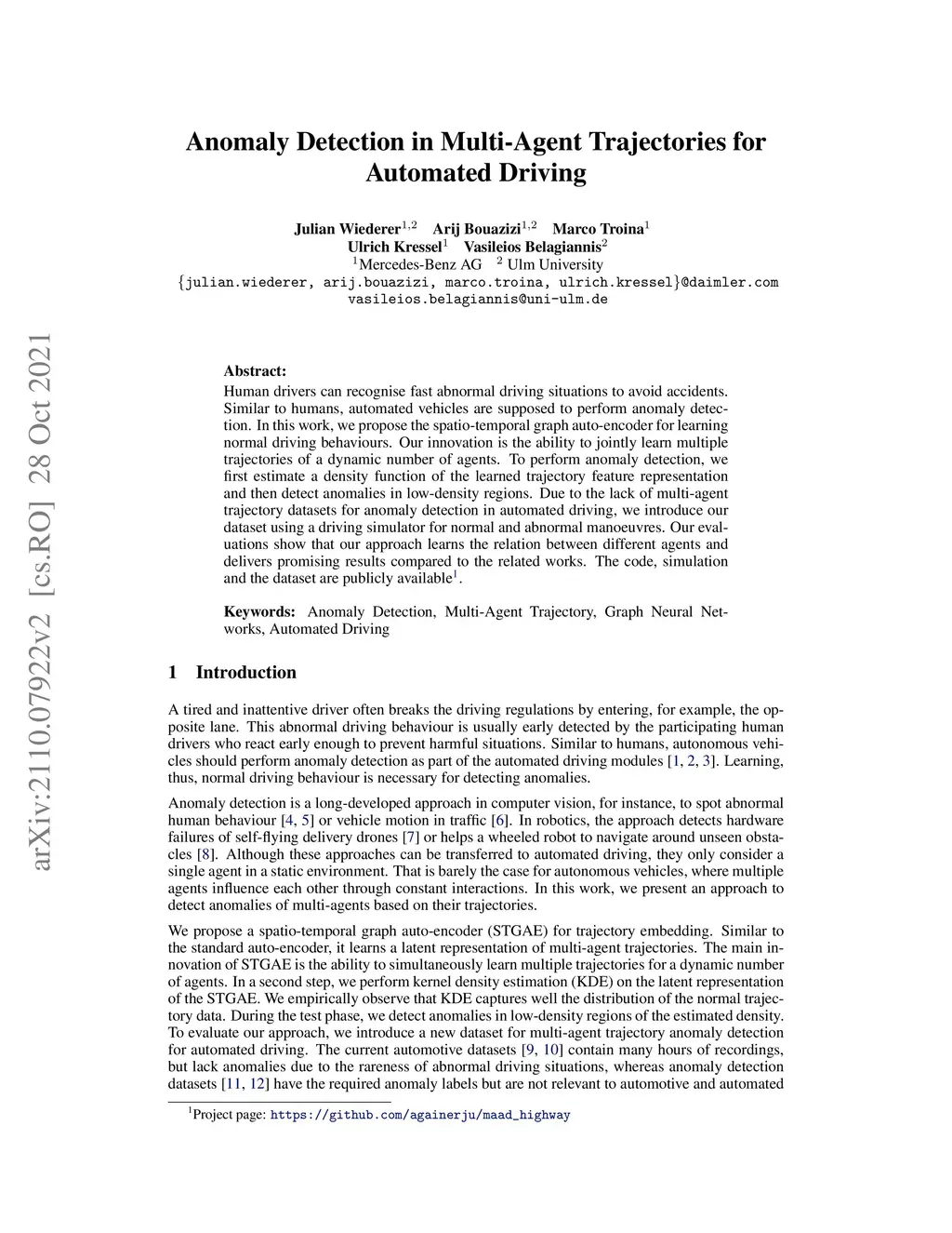 Human drivers can recognise fast abnormal driving situations to avoid accidents. Similar to humans, automated vehicles are supposed to perform anomaly detection. In this work, we propose the spatio-temporal graph auto-encoder for learning normal driving behaviours. Our innovation is the ability to jointly learn multiple trajectories of a dynamic number of agents. To perform anomaly detection, we first estimate a density function of the learned trajectory feature representation and then detect anomalies in low-density regions. Due to the lack of multi-agent trajectory datasets for anomaly detection in automated driving, we introduce our dataset using a driving simulator for normal and abnormal manoeuvres. Our evaluations show that our approach learns the relation between different agents and delivers promising results compared to the related works. The code, simulation and the dataset are publicly available on https://github.com/againerju/maad_highway.