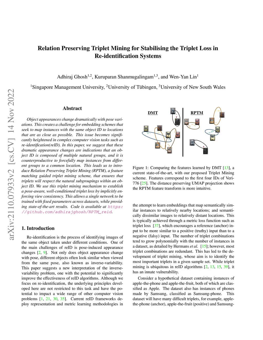 Object appearances change dramatically with pose variations. This creates a challenge for embedding schemes that seek to map instances with the same object ID to locations that are as close as possible. This issue becomes significantly heightened in complex computer vision tasks such as re-identification(reID). In this paper, we suggest that these dramatic appearance changes are indications that an object ID is composed of multiple natural groups, and it is counterproductive to forcefully map instances from different groups to a common location. This leads us to introduce Relation Preserving Triplet Mining (RPTM), a feature-matching guided triplet mining scheme, that ensures that triplets will respect the natural subgroupings within an object ID. We use this triplet mining mechanism to establish a pose-aware, well-conditioned triplet loss by implicitly enforcing view consistency. This allows a single network to be trained with fixed parameters across datasets while providing state-of-the-art results. Code is available at https://github.com/adhirajghosh/RPTM_reid.