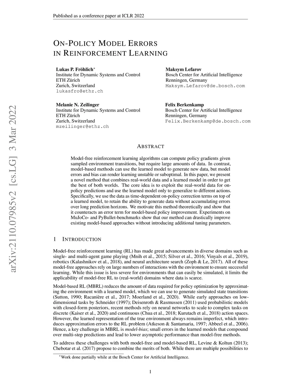 Model-free reinforcement learning algorithms can compute policy gradients given sampled environment transitions, but require large amounts of data. In contrast, model-based methods can use the learned model to generate new data, but model errors and bias can render learning unstable or suboptimal. In this paper, we present a novel method that combines real-world data and a learned model in order to get the best of both worlds. The core idea is to exploit the real-world data for on-policy predictions and use the learned model only to generalize to different actions. Specifically, we use the data as time-dependent on-policy correction terms on top of a learned model, to retain the ability to generate data without accumulating errors over long prediction horizons. We motivate this method theoretically and show that it counteracts an error term for model-based policy improvement. Experiments on MuJoCo- and PyBullet-benchmarks show that our method can drastically improve existing model-based approaches without introducing additional tuning parameters.