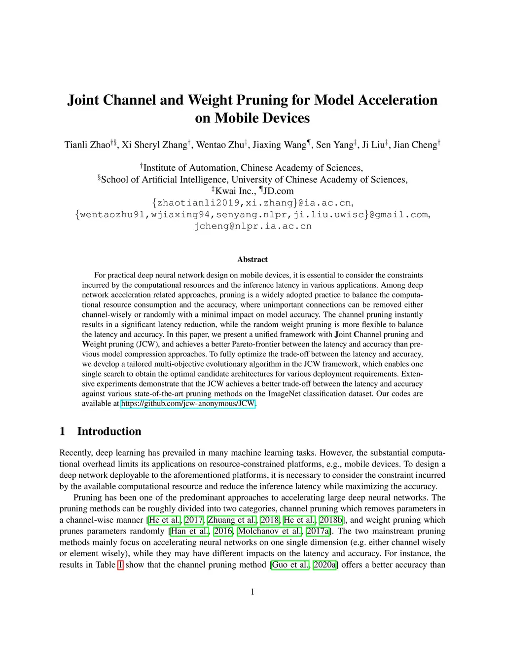 For practical deep neural network design on mobile devices, it is essential to consider the constraints incurred by the computational resources and the inference latency in various applications. Among deep network acceleration related approaches, pruning is a widely adopted practice to balance the computational resource consumption and the accuracy, where unimportant connections can be removed either channel-wisely or randomly with a minimal impact on model accuracy. The channel pruning instantly results in a significant latency reduction, while the random weight pruning is more flexible to balance the latency and accuracy. In this paper, we present a unified framework with Joint Channel pruning and Weight pruning (JCW), and achieves a better Pareto-frontier between the latency and accuracy than previous model compression approaches. To fully optimize the trade-off between the latency and accuracy, we develop a tailored multi-objective evolutionary algorithm in the JCW framework, which enables one single search to obtain the optimal candidate architectures for various deployment requirements. Extensive experiments demonstrate that the JCW achieves a better trade-off between the latency and accuracy against various state-of-the-art pruning methods on the ImageNet classification dataset. Our codes are available at https://github.com/jcw-anonymous/JCW.